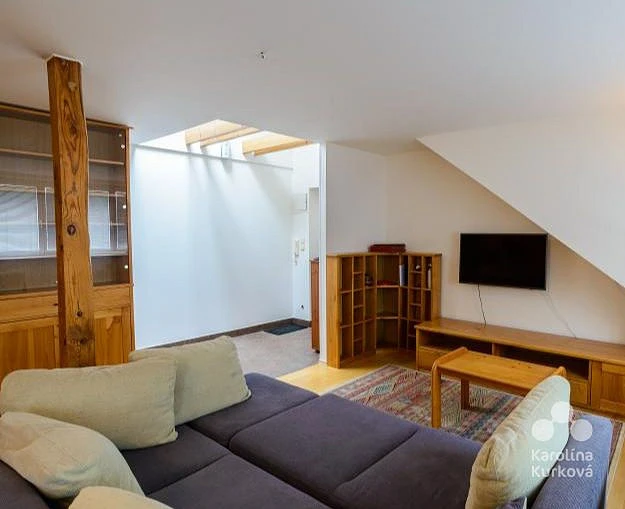 Spodní patro bytu tvoří prostorný obývací pokoj propojený s kuchyňským koutem, samostatná uzavíratelná ložnice, koupelna s vanou, komora a technická místnost.