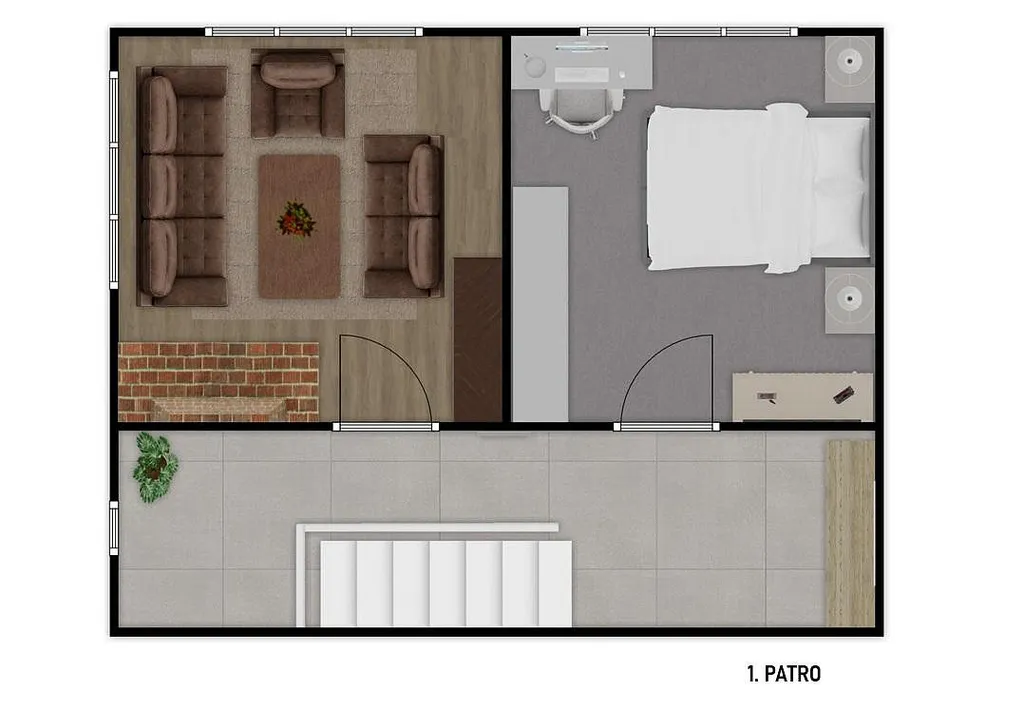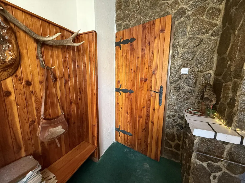 Po schodišti vystoupáme do prvního patra chodby o velikosti cca 11,24 m². Na patře jsou dvě místnosti, z toho jedna je vybavena krásným funkčním krbem o celkové výměře 15,20 m². Tato místnost je plně vybavena nábytkem. Druhá místnost má celkovou plochu cca 17,26 m². V přízemí vedle schodiště nalezneme sklep o výměře cca 4,80 m².