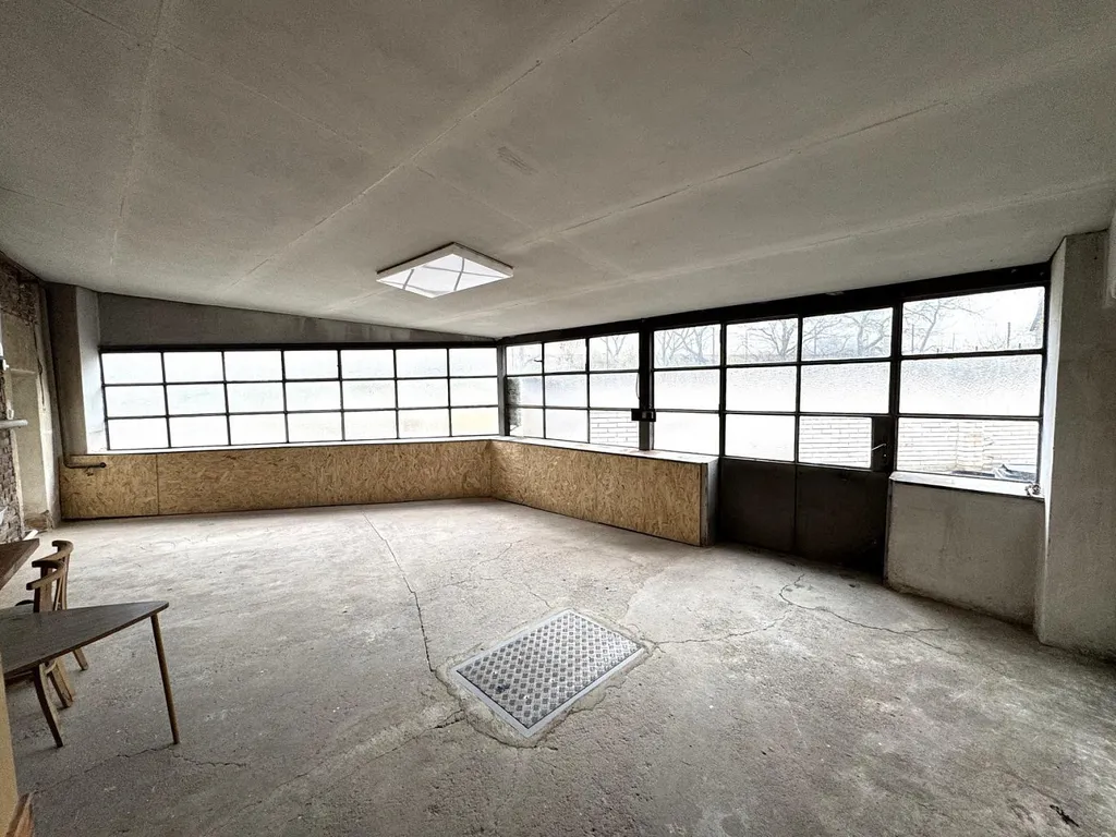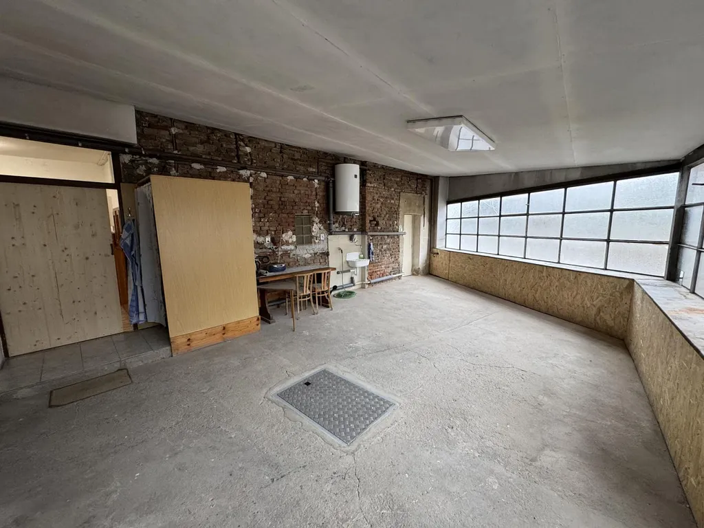 Z chodby projdeme posuvnými dřevěnými dveřmi do ateliéru o celkové výměře cca 38,7 m², ve kterém je umístěn elektrický boiler zajišťující ohřev vody. Z ateliéru je vstup na samostatné WC o výměře cca 1,02 m². Vedle WC se nachází vstup do sklepního prostoru o celkové velikosti cca 11,75 m², ve kterém je plynový kotel značky Enbra zajišťující vytápění pro celý dům. Z ateliéru je také vstup do skladu o celkové výměře cca 3,55 m². Velkými vraty projdeme na prostorný dvůr o velikosti cca 110 m². Je zde dostatečná plocha, na které můžou parkovat až tři automobily, ale i pro příjemné posezení zajišťující klid a relaxaci. Ve dvoře je také vjezd do garáže o celkové výměře cca 20 m². Vjezd do dvora je z druhé strany domu za železnými vraty.