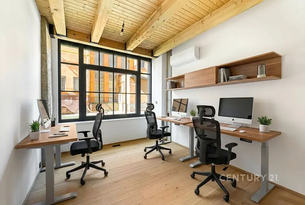 V horním podlaží se nachází další otevřený prostor vhodný pro pracovní zónu nebo relaxační část, samostatná toaleta a uzavřená místnost s vlastním sociálním zázemím, kterou lze využít například jako privátní kancelář vedení, zasedací místnost nebo klidovou zónu.