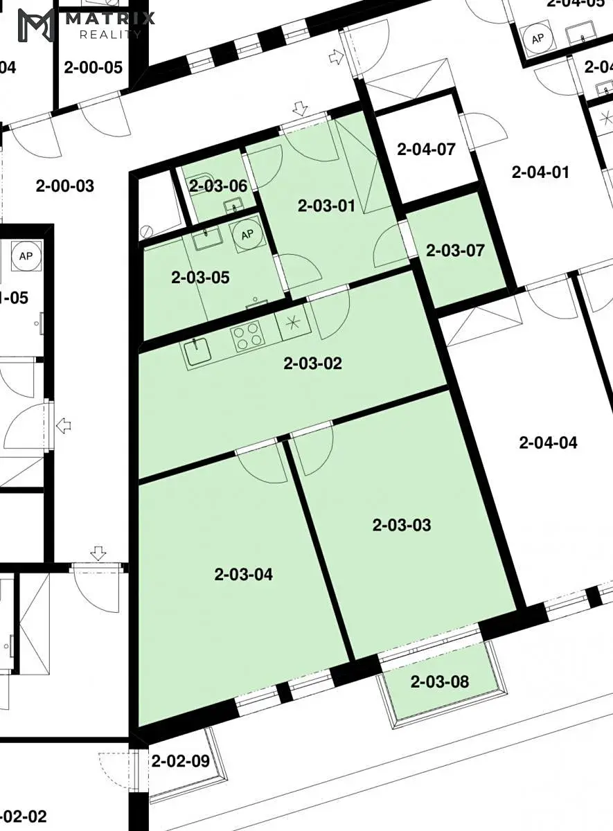 Prostorná chodba, koupelna se sprchovým koutem, samostatné WC. Kuchyň s kuch. linkou - vest. spotřebiče, el. varná deska, el. trouba, myčka, lednice.