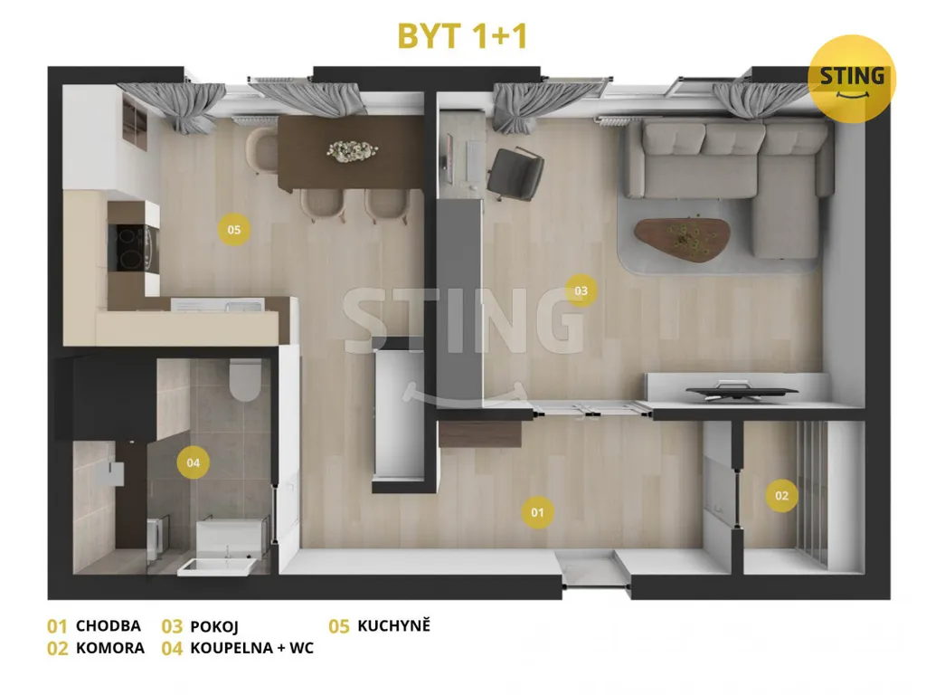 V bytě je prostorný světlý pokoj s upraveným podhledem, zapuštěnými světly a dekorativní osvětlenou nikou. Na podlaze je nová světlá vinylová podlaha. Velkou výhodou bytu je samostatná komora, kterou lze využít jako šatnu nebo úložný prostor.