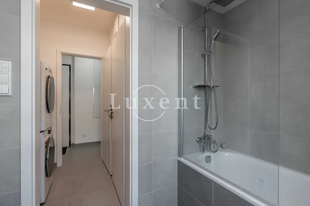 Dispozice zahrnují prostornou obývací místnost s moderním kuchyňským koutem na míru, ložnici, pracovnu či dětský pokoj, vstupní chodbu, koupelnu s vanou, oddělenou toaletu a technickou místnost s pračkou a sušičkou.