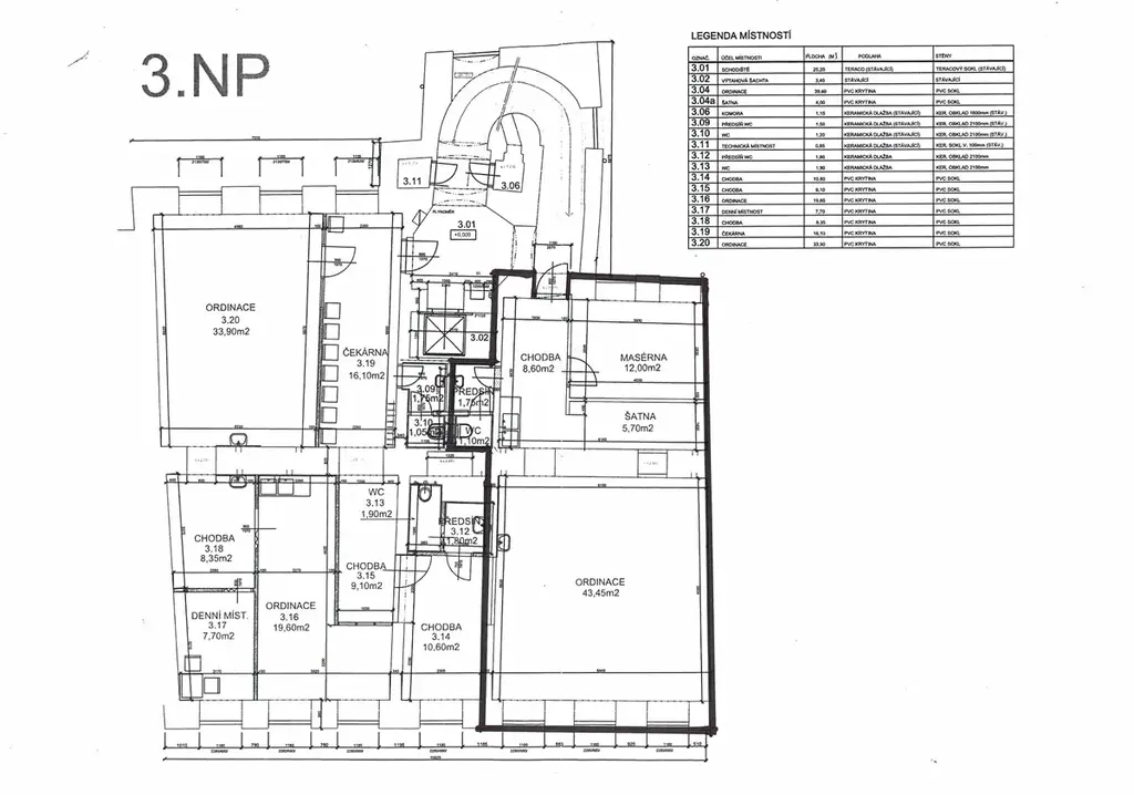 • hlavní místnost (ordinace): 43,5 m²
