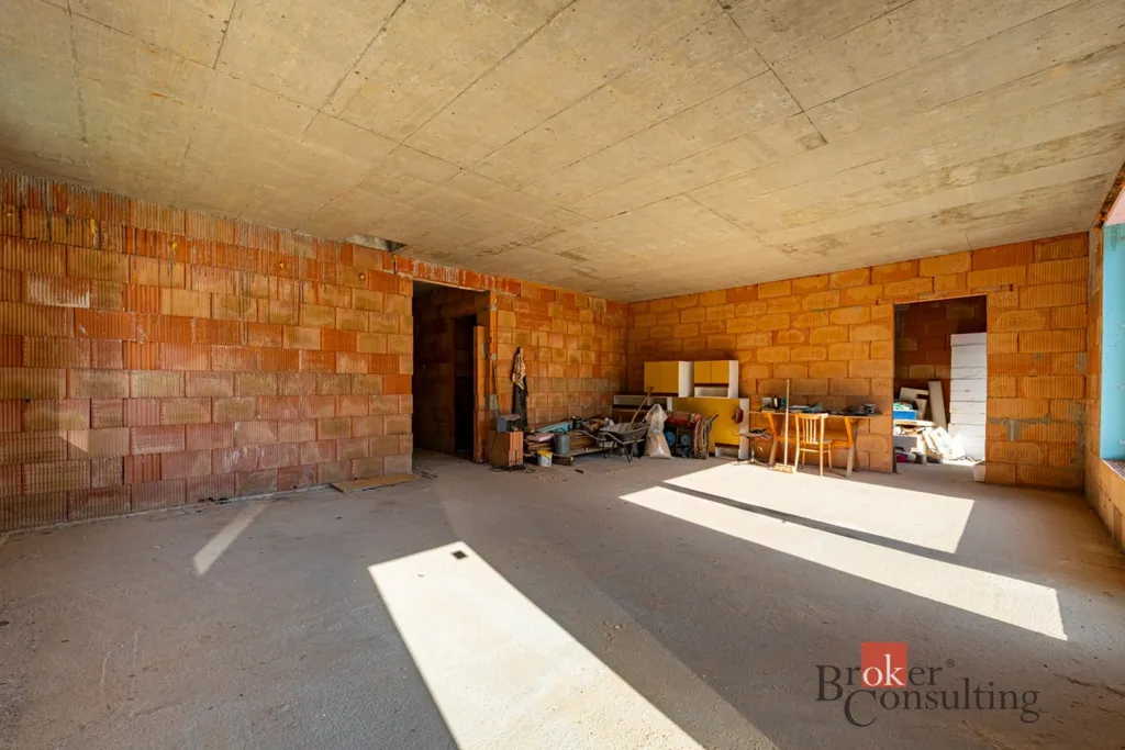 Dům je rozestavěný – hotová je hrubá stavba, krov, střecha a osazená plastová okna včetně vstupních dveří. Použity byly cihly HELUZ a kvalitní stavební materiály. Vnitřní příčky jsou provedené částečně a dokončení interiéru už bude na budoucím majiteli.