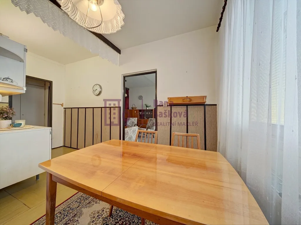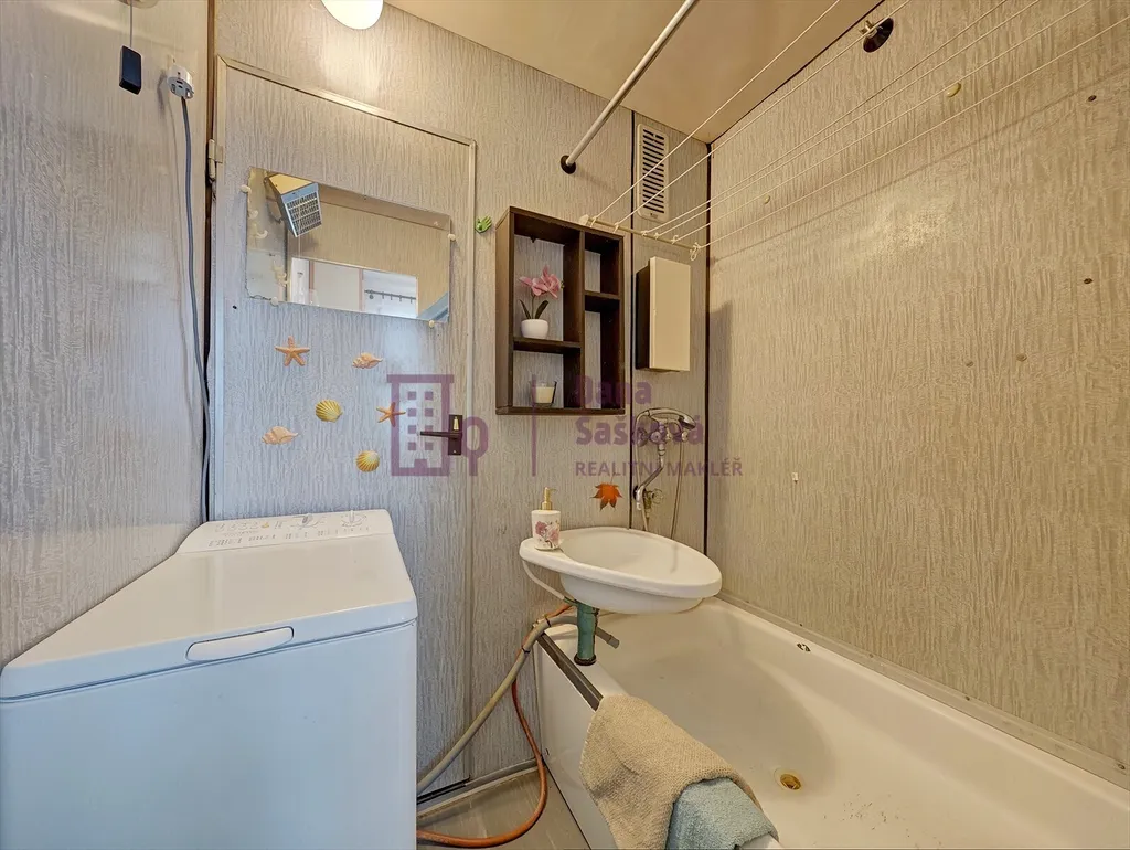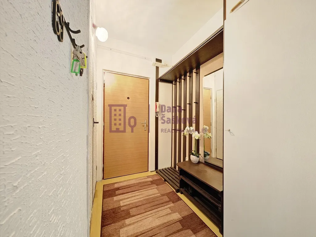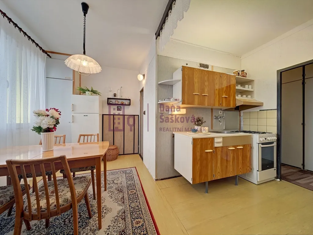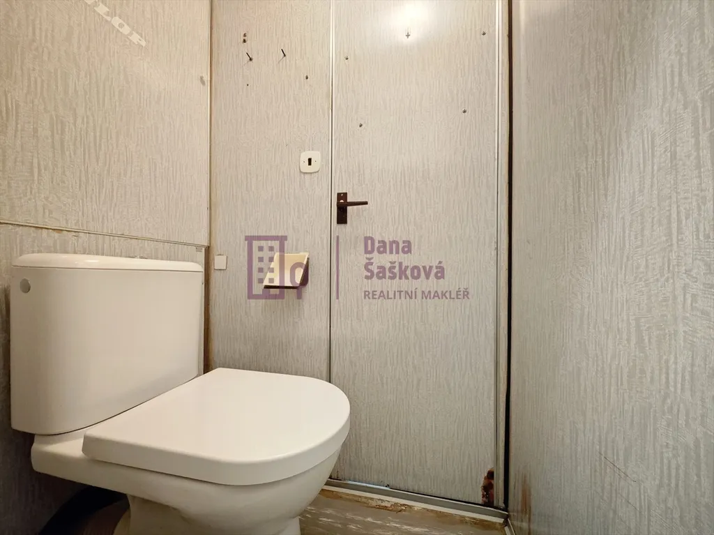 Dispozice 1+1 nabízí předsíň s vestavěnými skříněmi, kuchyni s jídelním koutem, pokoj, koupelnu se sprchovým koutem a samostatnou toaletu.