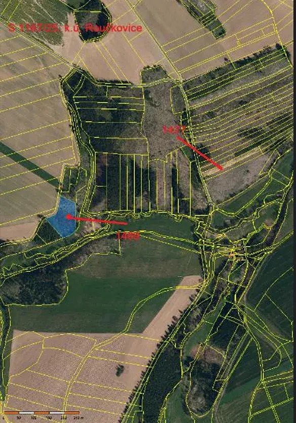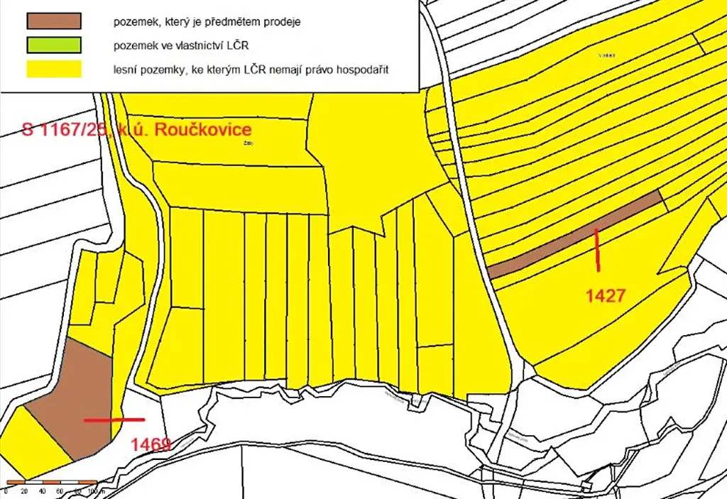 Jedná se o prodej 2 lesních pozemků parc. č. 1427 o výměře 2865 m2 a parc. č. 1469 o výměře 8130 m2, nacházejících se východně od obce Roučkovice, obklopené jiných vlastníků. Pozemek parc. č. 1427 vyl vytěžen, klest vyklizen a plocha není zalesněna. Na pozemku parc. č. 1469 byly porosty vytěženy, plocha není zalesněna roste na něm pár listnatých stromů.