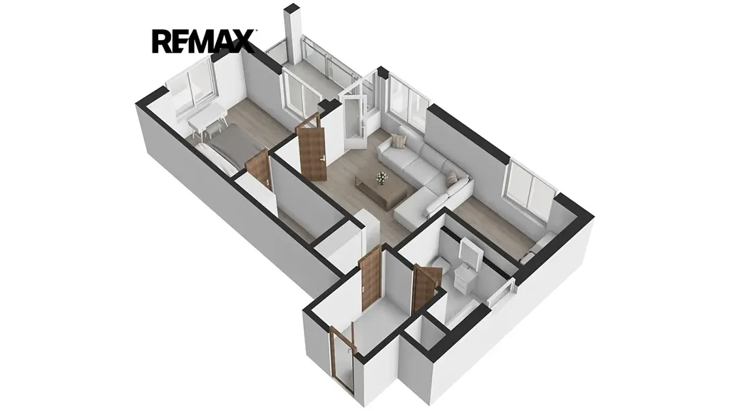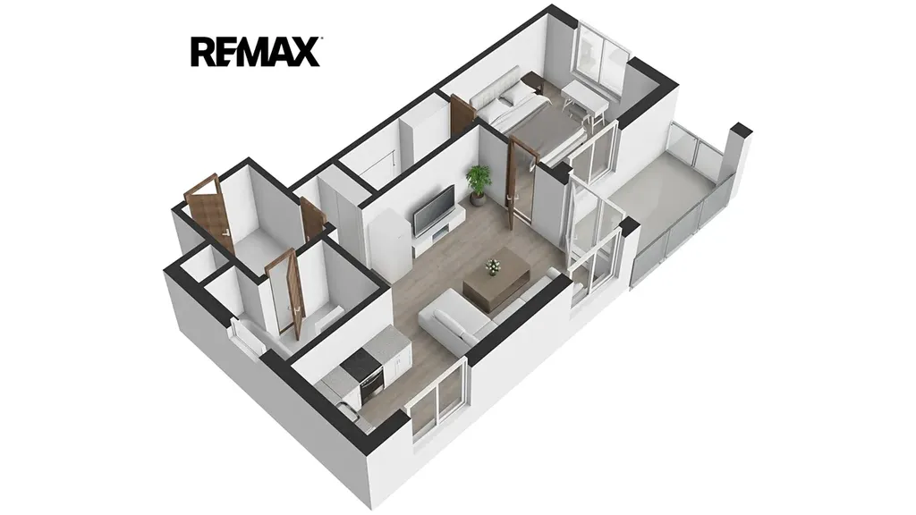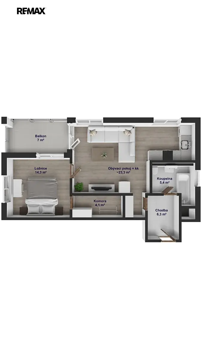 Dispozice je řešena velmi efektivně – obývací pokoj se zařízeným kuchyňským koutem a přímým vstupem na balkón, samostatná ložnice s přístupem do šatny, prostorná chodba a koupelna s vanou a otopným žebříkem. Velkým benefitem jsou úložné prostory řešené na míru, které dávají bytu nadstandardní funkčnost pro každodenní život. Díky orientaci na více světových stran (jih, východ, západ) je byt přirozeně světlý a vzdušný po celý den.