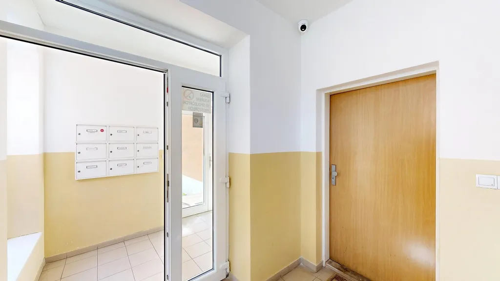 Byt má okna do vnitrobloku, což zajišťuje klid a soukromí. Předsíň a koupelna s WC, vanou a prostorem pro pračku mají keramickou dlažbu, obytný prostor s kuchyňským koutem plovoucí lamino podlahu. Dispozice je praktická, vhodná jak pro vlastní bydlení pro pár, tak jako investice k pronájmu.