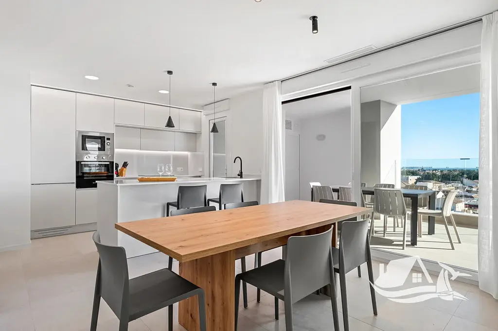 Interiér je kompletně dokončený, zařízený a připravený k okamžitému užívání. Součástí je plně vybavená kuchyně se spotřebiči, nábytek, textilie i základní vybavení domácnosti, což umožňuje bezstarostné nastěhování nebo okamžité zahájení pronájmu. Porcelánové podlahy dodávají prostoru moderní vzhled, podlahové vytápění v koupelnách zvyšuje komfort a centrální klimatizace zajišťuje příjemné klima po celý rok. Nechybí ani elektrické rolety, videotelefon, bezpečnostní dveře a kvalitní okna s tepelnou izolací.