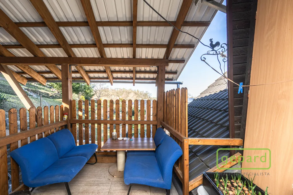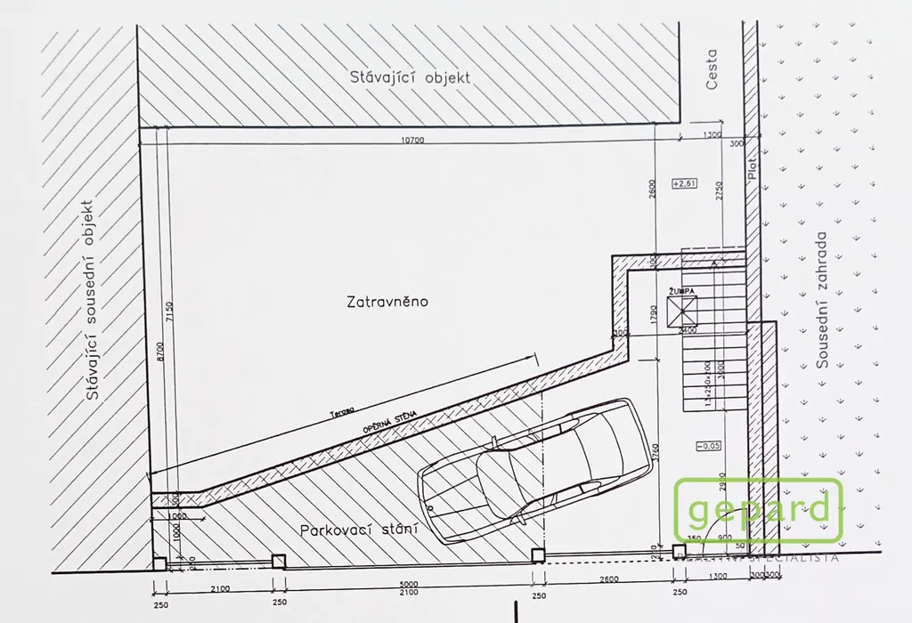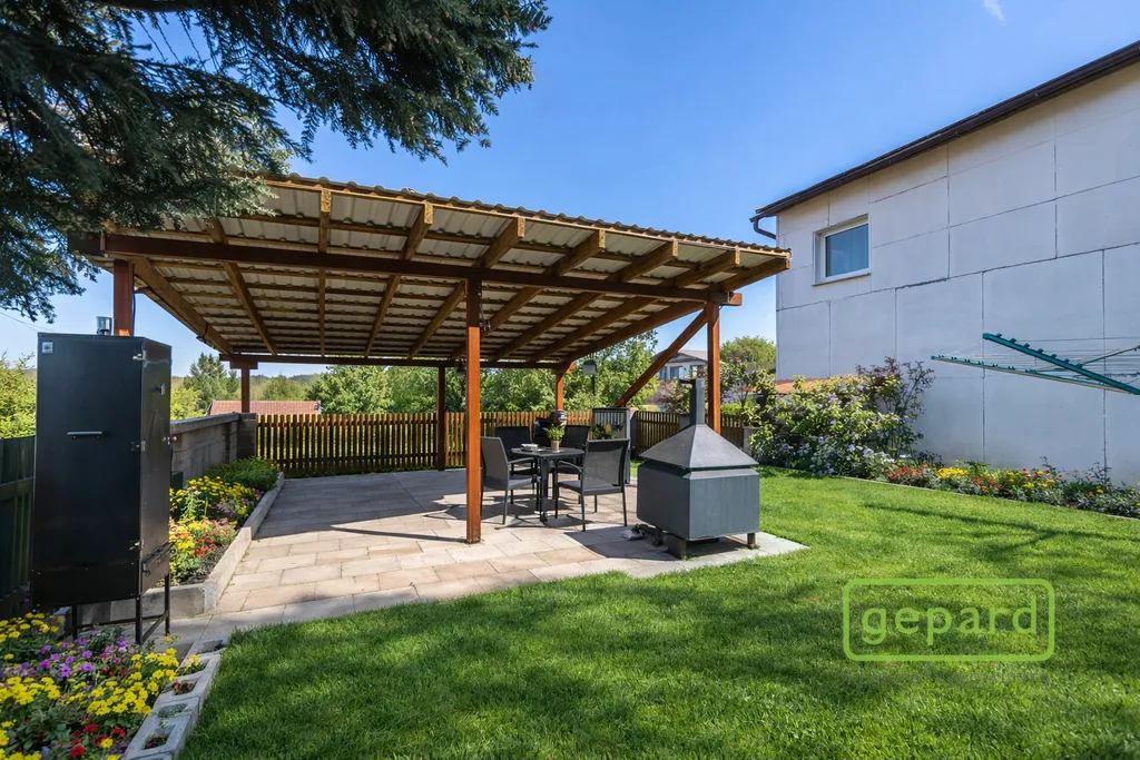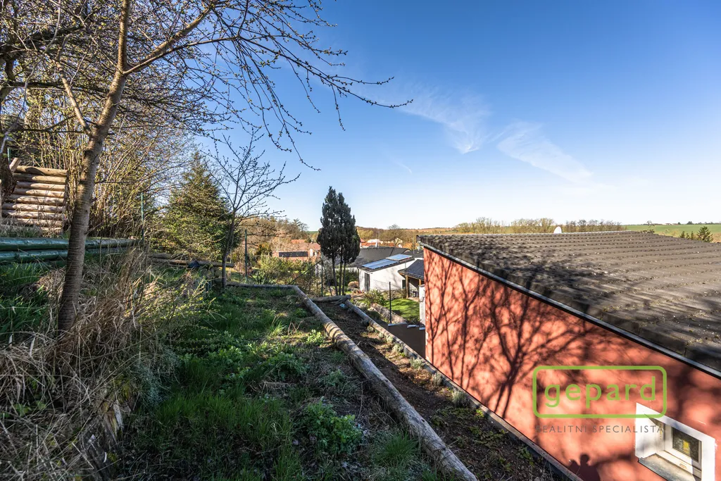 Pozemek je svažitý. Horní zahrada (200 m2) nabízí velmi pěkný výhled na okolí. Terén zahrady je terasovitě upravený, proto může sloužit jako zeleninová a ovocná zahrada. V přední části pozemku se na nezastavěné části nádvoří nachází terasa se zahradou, pergolou a posezením. Na úrovni ulice je zastřešené parkovací stání umístěné pod nádvořím s terasou a zahradou.