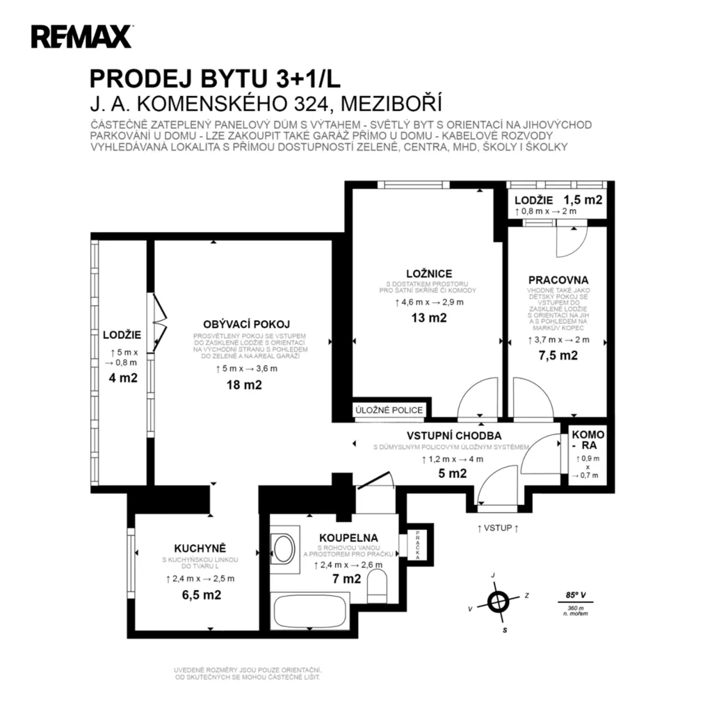 Nabízíme k prodeji útulný byt po částečné rekonstrukci 3+1 s velkou a malou zasklenou lodžií, sklepem a dalším nadstandardně rozměrným sklepem s plochou 20m2 / pronajatým od SVJ za 160 Kč/měs./ v osobním vlastnictví o užitné ploše 67,2 m² / byt 61,1 m2, lodžie velká 4,5 m2, lodžie malá 1,6 m2 + sklepní koje jako další prostor ( není započten v užitné ploše ) v klidné a vyhledávané lokalitě Meziboří, J.A.Komenského 324. K bytu náleží sklep 2m2 + další pronajatý sklep 20 m2. Byt se nachází v 8. NP částečně zatepleného domu s výtahem. / vnitřní příčky cihla / Orientace bytu - jihovýchodní směr, slunná část.