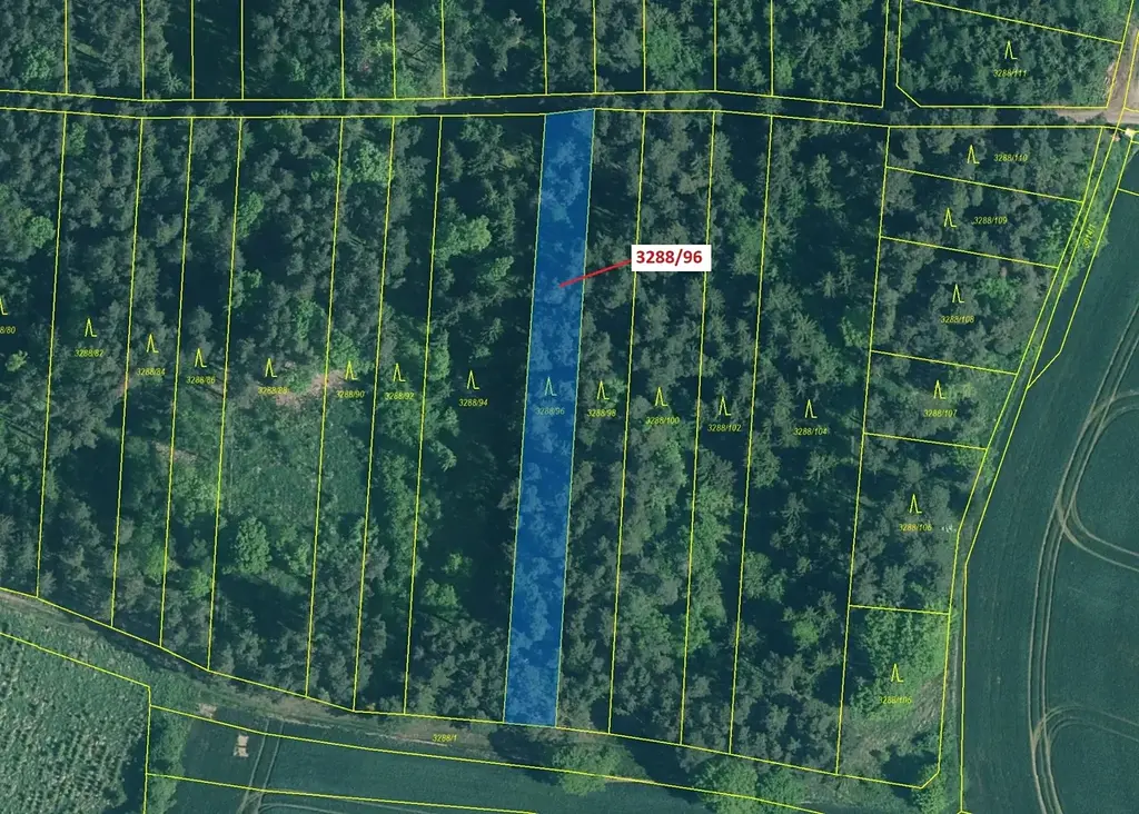 Lesní pozemek o výměře 1630 m2, parcelní číslo 3288/96, podíl 1/1, katastrální území Hosty, obec Hosty, obec s rozšířenou působností Týn nad Vltavou, okres České Budějovice, Jihočeský kraj. Po těžbě.
