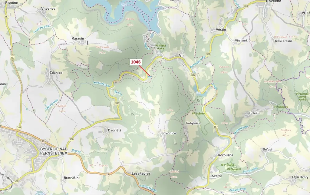 Lesní pozemek o výměře 2432 m2, parcelní číslo 1046, podíl 1/1, katastrální území Hrdá Ves, obec Vír, obec s rozšířenou působností Bystřice nad Pernštejnem, okres Žďár nad Sázavou, Kraj Vysočina. Po těžbě.