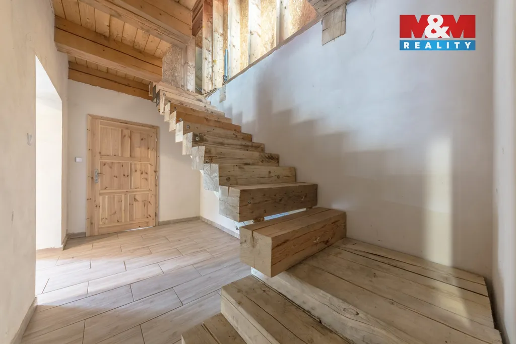 Dům stojí na pozemku o výměře 1 486 m², je částečně podsklepený. Spodní podlaží je zděné, horní dvě podlaží jsou řešena jako dřevostavba. Dispozice přízemí zahrnuje velký obytný prostor s kuchyňským koutem, zázemí a vstup na terasu s navazujícím balkonem. Horní podlaží jsou připravena k dokončení dle individuálních požadavků.