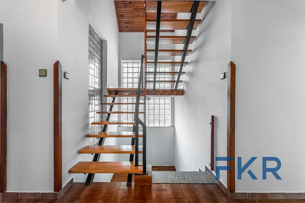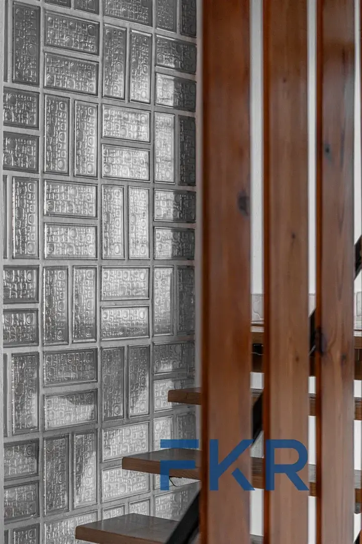 Obytné podkroví je přístupné odlehčeným schodištěm ze dřeva a oceli, doplněné o prosklení sklobetonkou.