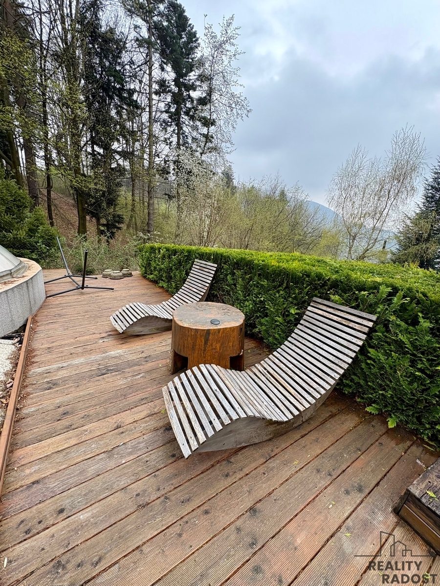 Součástí pozemku je i zázemí pro odpočinek a volný čas – pergola s posezením a grilem, kůlna, skleník, kryté parkovací stání a krytý bazén s navazující dřevěnou terasou. Vybavení zůstává součástí prodeje.