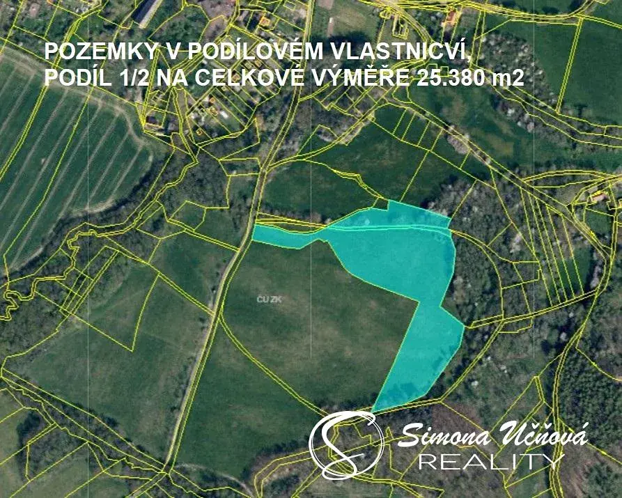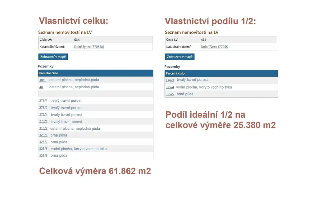 Předmětem prodeje jsou pozemky zapsané na LV č. 534 o celkové výměře 61.862 m2 a spoluvlastnický podíl o velikosti ideální 1/2 na pozemcích zapsaných na LV 474 o celkové výměře 25.380 m2, vše pro katastrální území Dolní Týnec.