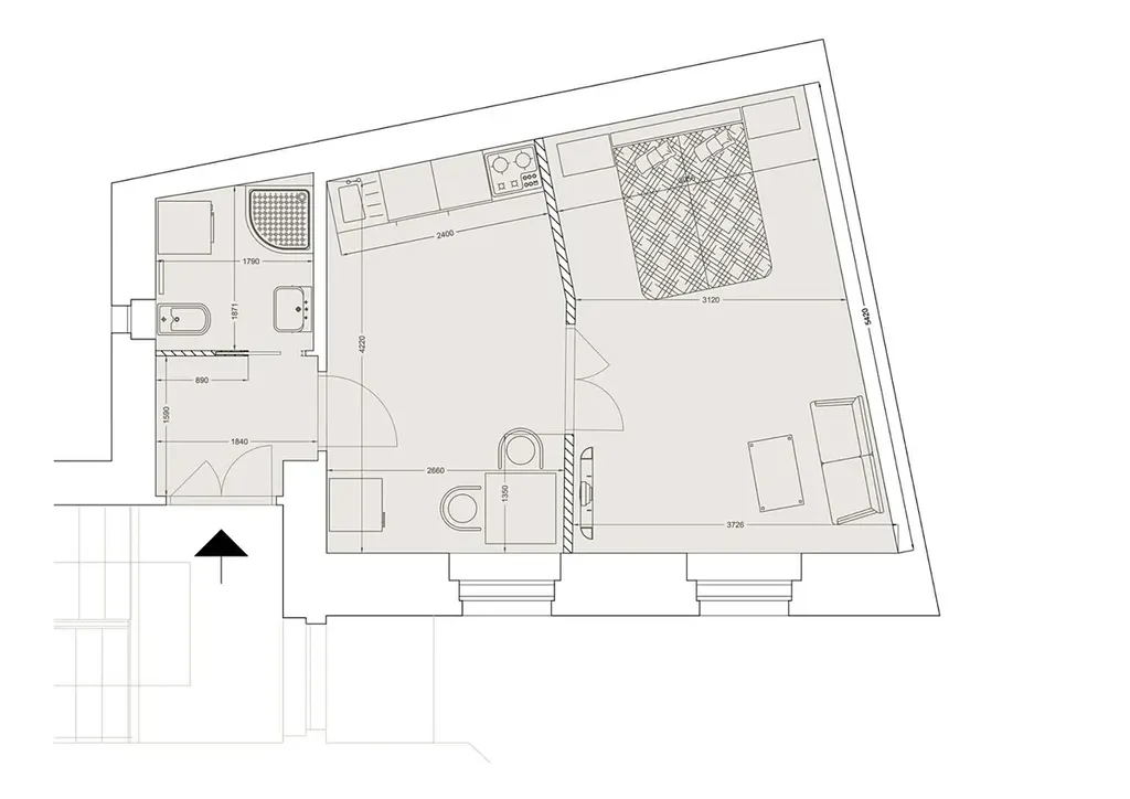 Zrekonstruovaný byt 2+kk (o celkové ploše 34,48m2), s orientací do klidného vnitrobloku, je situovaný v 2.patře (3.NP) reprezentativní budovy s výtahem, v oblíbené lokalitě Praha 2 Nové Město. Interiér bytu je nezařízený a dispozičně nabízí vstupní předsíň (2,77m2), kuchyň (11,91m2), ze které je vstup do ložnice (16,45m2) spojené s obývacím prostorem. Kuchyň je vybavená novou kuchyňskou linkou včetně spotřebičů: lednice s mrazákem, varná deska a elektrická trouba. Moderní koupelna má vstup z předsíně a disponuje sprchovým koutem, toaletou a pračkou.