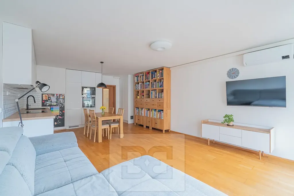 Dominantou bytu je prostorný obývací pokoj s kuchyňským koutem o výměře 34,2 m², ze kterého je přímý vstup na balkon o velikosti 7,32 m². Balkon je orientovaný na jihozápad. Na balkoně se nachází klimatizační jednotka.