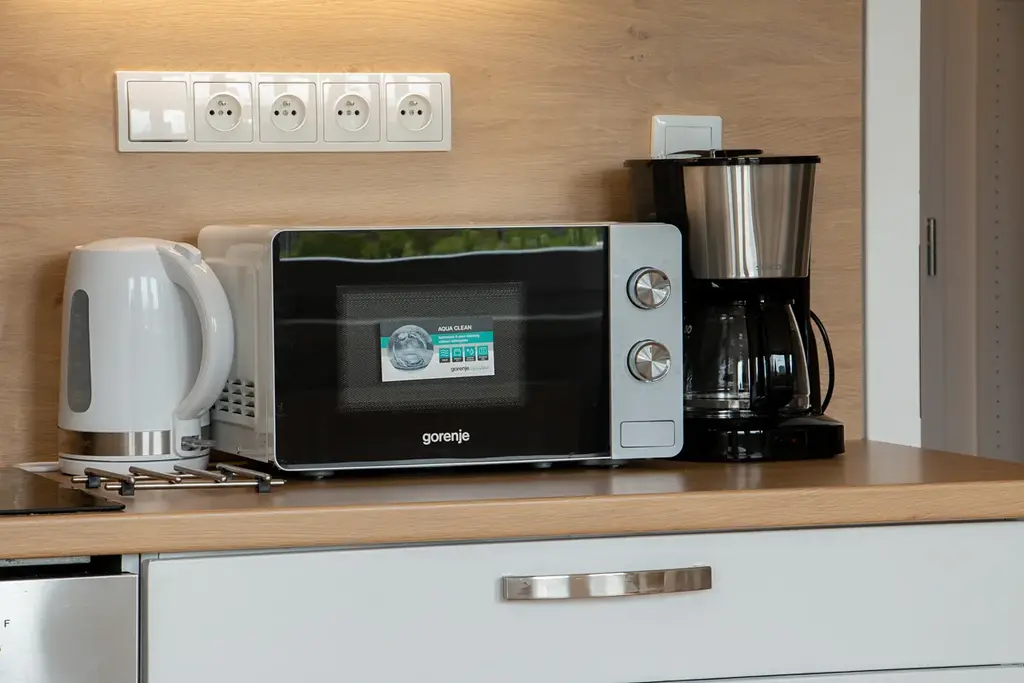 Byt je plně zařízen. Kuchyňský kout je vybaven kuchyňskou linkou a elektrickými spotřebiči. K dispozici jsou společné prostory budovy včetně střešní terasy s výhledem, fitness centra a recepce s obsluhou 24 hodin denně.