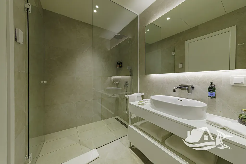 Celková plocha jednotky činí 91,80m², k níž náleží prostorná terasa o velikosti 11,20 m² s úchvatným výhledem na Jaderské moře. Interiér je zařízen moderním a vkusným nábytkem, který podtrhuje kvalitu a styl celého prostoru.
