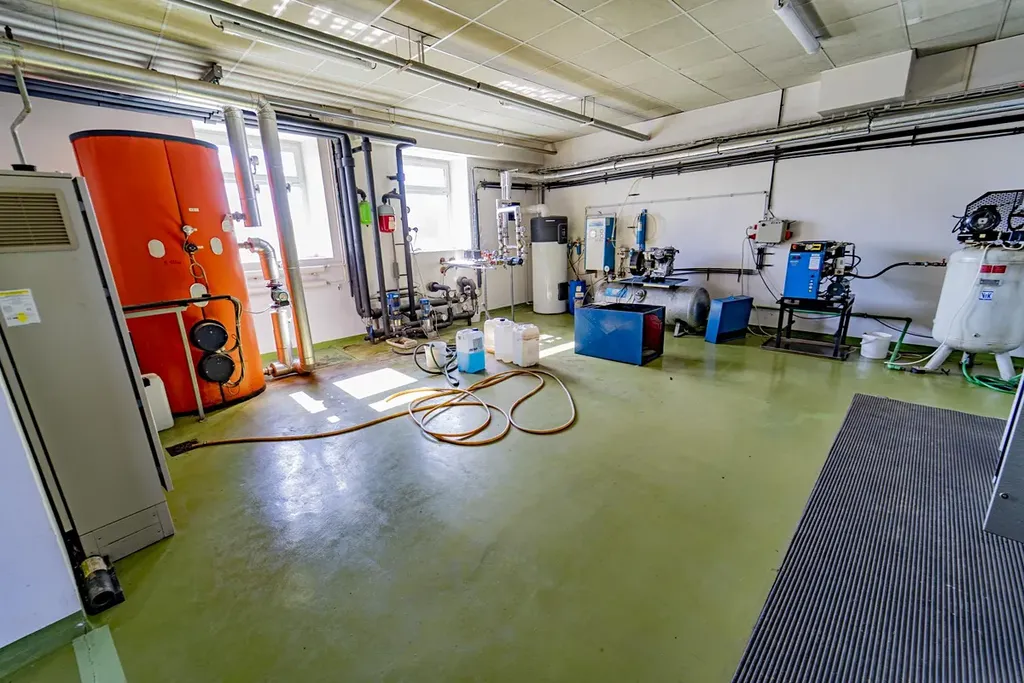 Areál je napojen na veřejné rozvody elektřiny a vody, odpadní vody jsou řešeny vlastní jímkou. Vytápění je zajištěno tepelným čerpadlem. Velkou výhodou je vlastní trafostanice vysokého napětí, která zajišťuje dostatečný výkon pro průmyslový provoz. K dispozici je také extrakční linka (aktuálně nefunkční), průmyslový kompresor, řetězový kladkostroj, chladicí soustava, klimatizace a další technologie související s provozem areálu.
