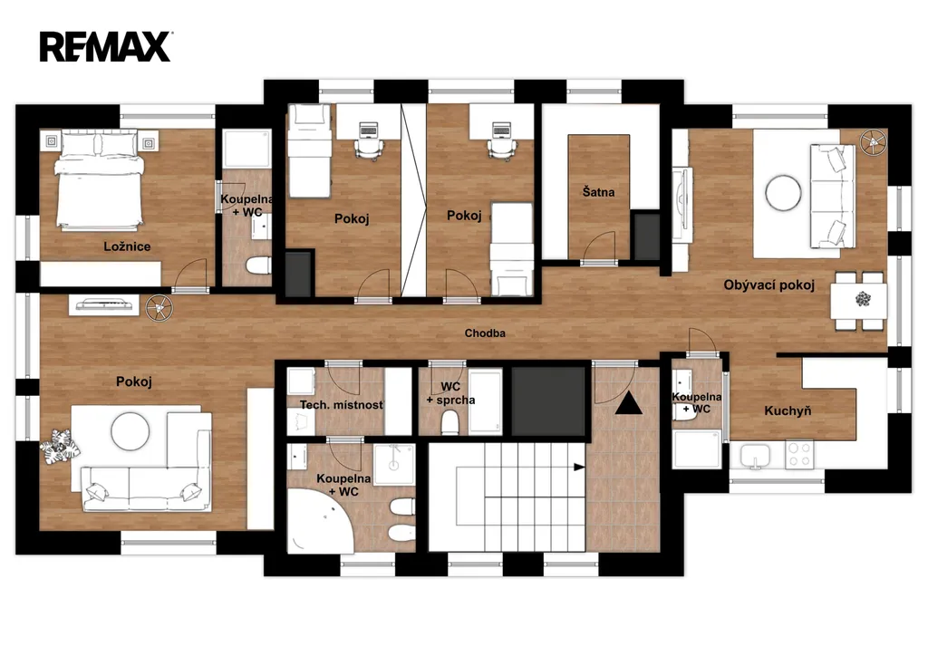 Dispozičně je prostor velmi prakticky řešen. Dominantou je centrální místnost vhodná jako open space nebo společná pracovní zóna, na kterou navazuje několik samostatných místností ideálních jako kanceláře, zasedací místnosti či individuální pracovní prostory. K dispozici je dále šatna, technická místnost a celkem 4 koupelny s toaletou, což zajišťuje komfortní zázemí i pro větší tým. Velká okna přinášejí dostatek denního světla do všech částí prostoru.