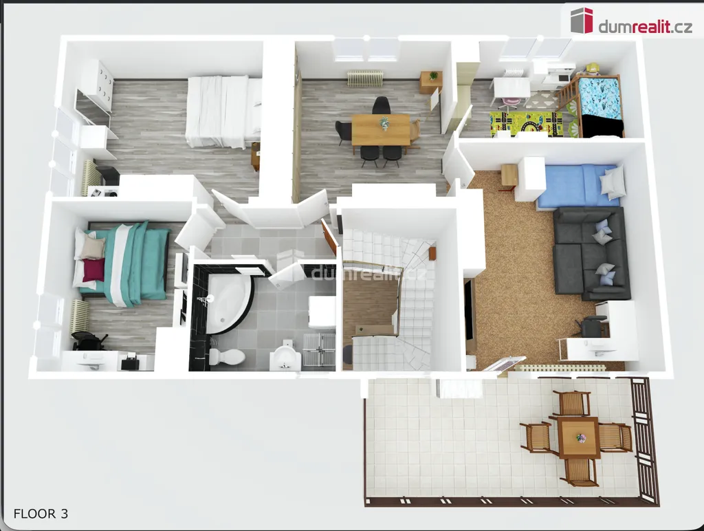 Moderněji koncipované podlaží, kterému vévodí světlý obývací pokoj propojený s kuchyňským koutem a jídelnou. Z obývacího pokoje je přímý vstup na velkou terasu (17 m²) s výhledem do zeleně, ideální pro letní snídaně nebo večerní relaxaci. Nachází se zde další tři samostatné neprůchozí pokoje a stylová koupelna s rohovou vířivou vanou.