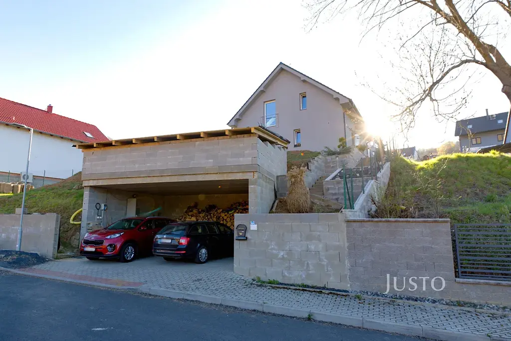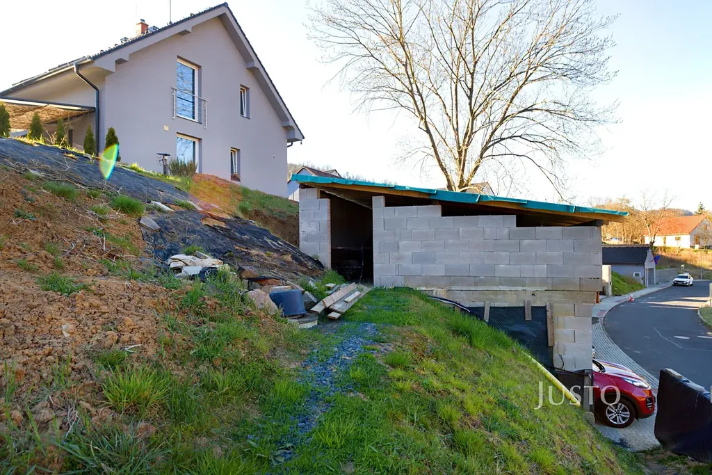 • parkování: prostorná garáž (230 V a 380 V) s vybudovaným patrem, aktuálně ve stavu před dokončením, dosud nezkolaudovaná + několik míst před domem