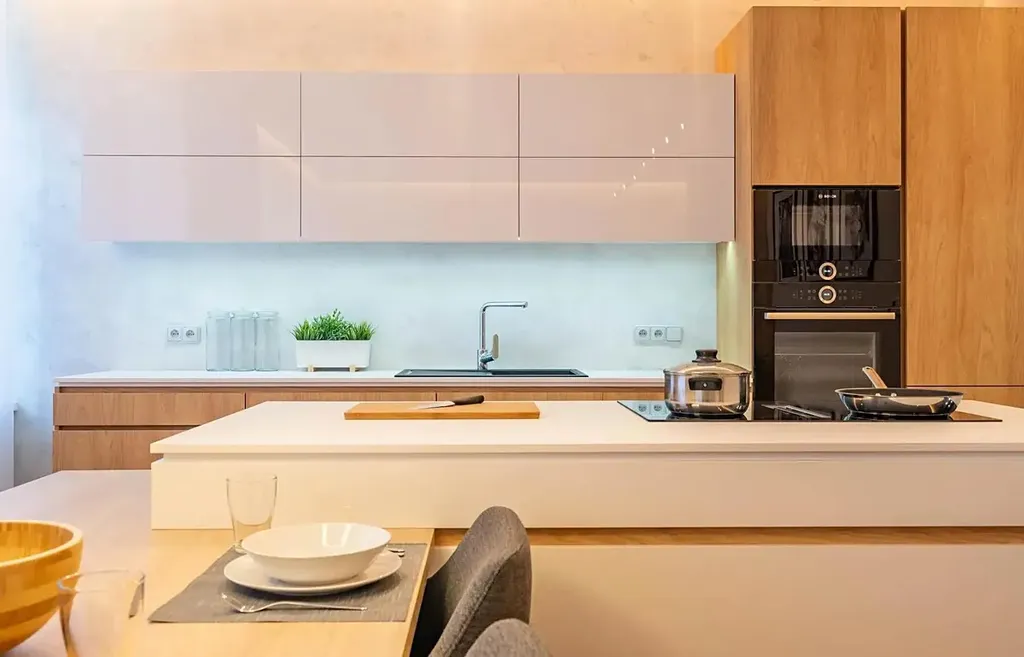 Byt je vybaven luxusní kuchyňskou linkou včetně všech spotřebičů značky Bosch (lednice, mražák, myčka, indukce s vnitřním odtahem, mikrovlná i horkovzdušná trouba), elegantním ostrůvkem na vaření, jídelním stolem a židlemi.
