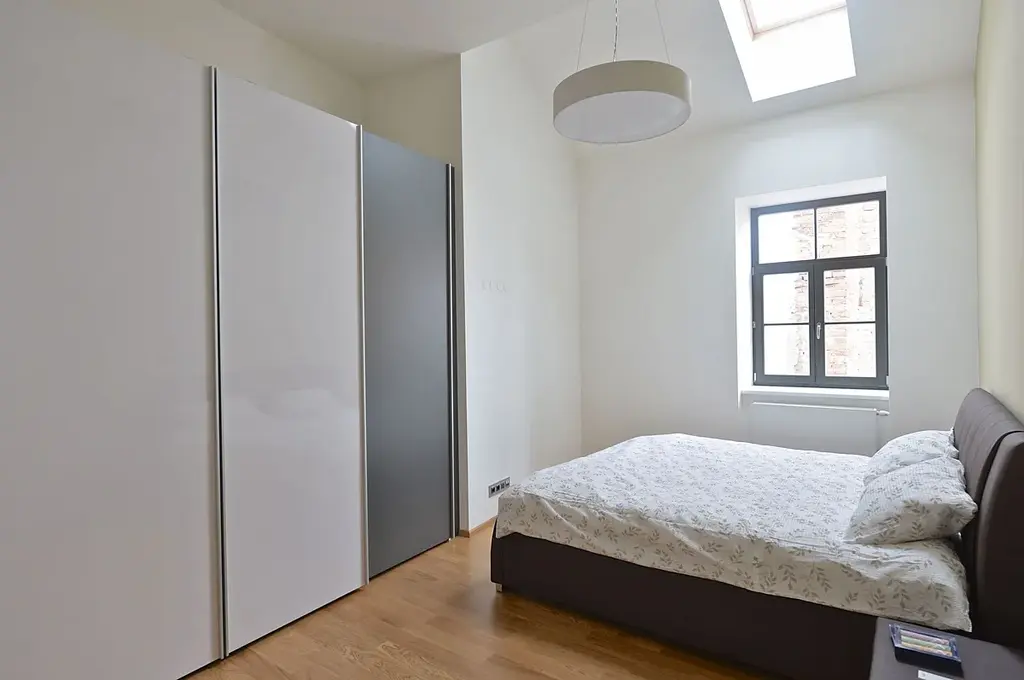 Moderní částečně zařízený byt v 5. patře historické budovy s výtahem, dnešního rohového paláce, postaveného ze čtyř středověkých měšťanských domů v 19. století, v srdci Brna, jen pár kroků od náměstí Svobody a mnoha historických památek.Byt sestává z obývacího pokoje s plně vybaveným kuchyňským koutem, jedné ložnice s balkonem orientovaným do vnitrobloku, koupelny se sprchovým koutem a toaletou a vstupní haly s úložným prostorem.