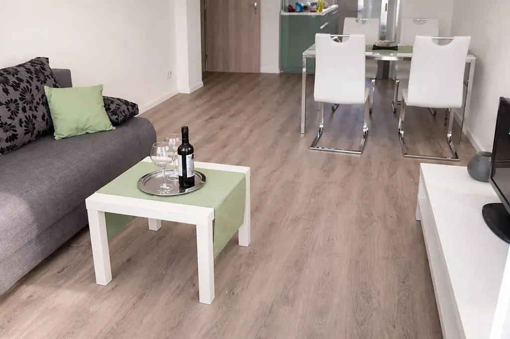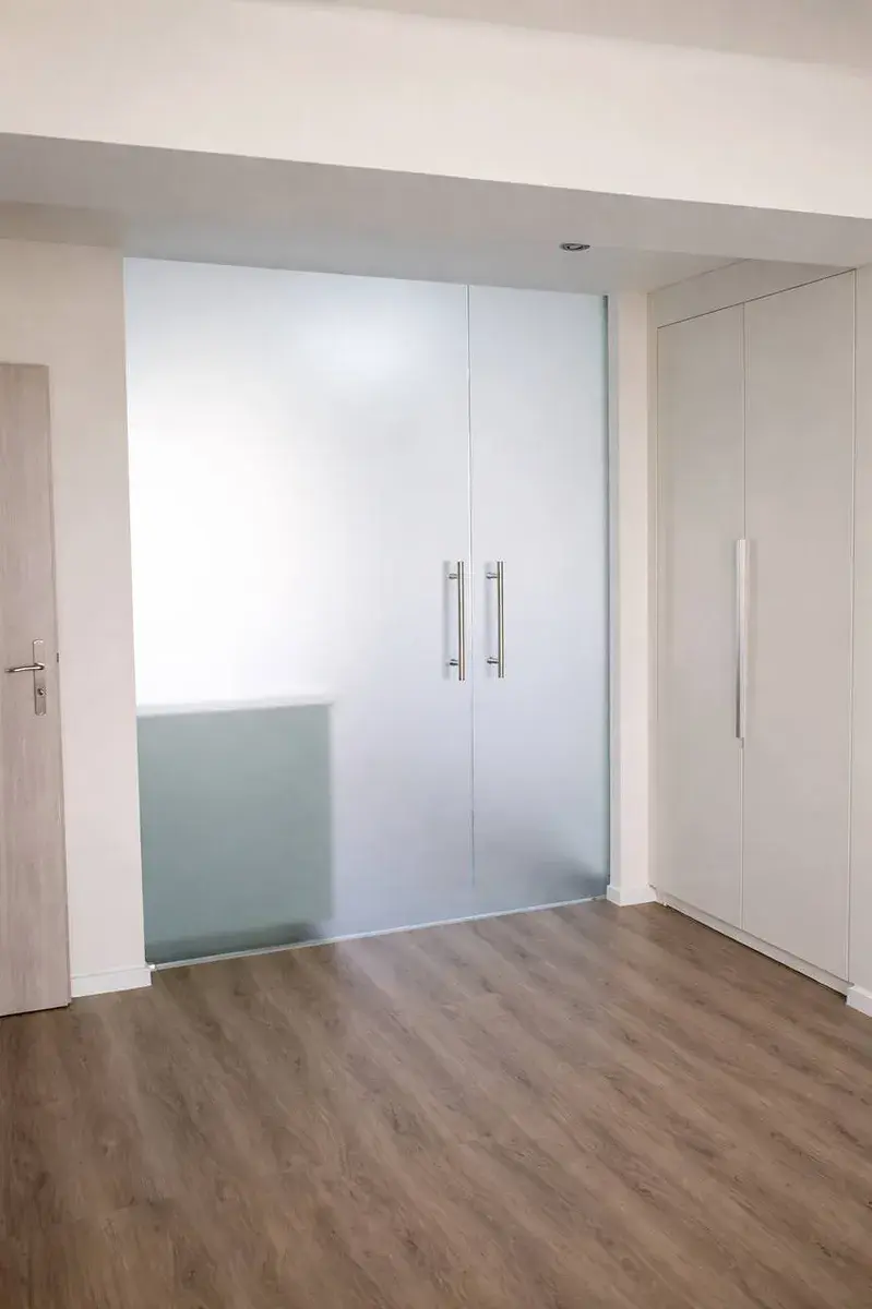 • Obývací pokoj s kuchyňským koutem: Světlý prostor s kuchyňskou linkou, prakticky oddělen posuvnou stěnou z matného skla, která zajišťuje soukromí a flexibilitu využití prostoru.