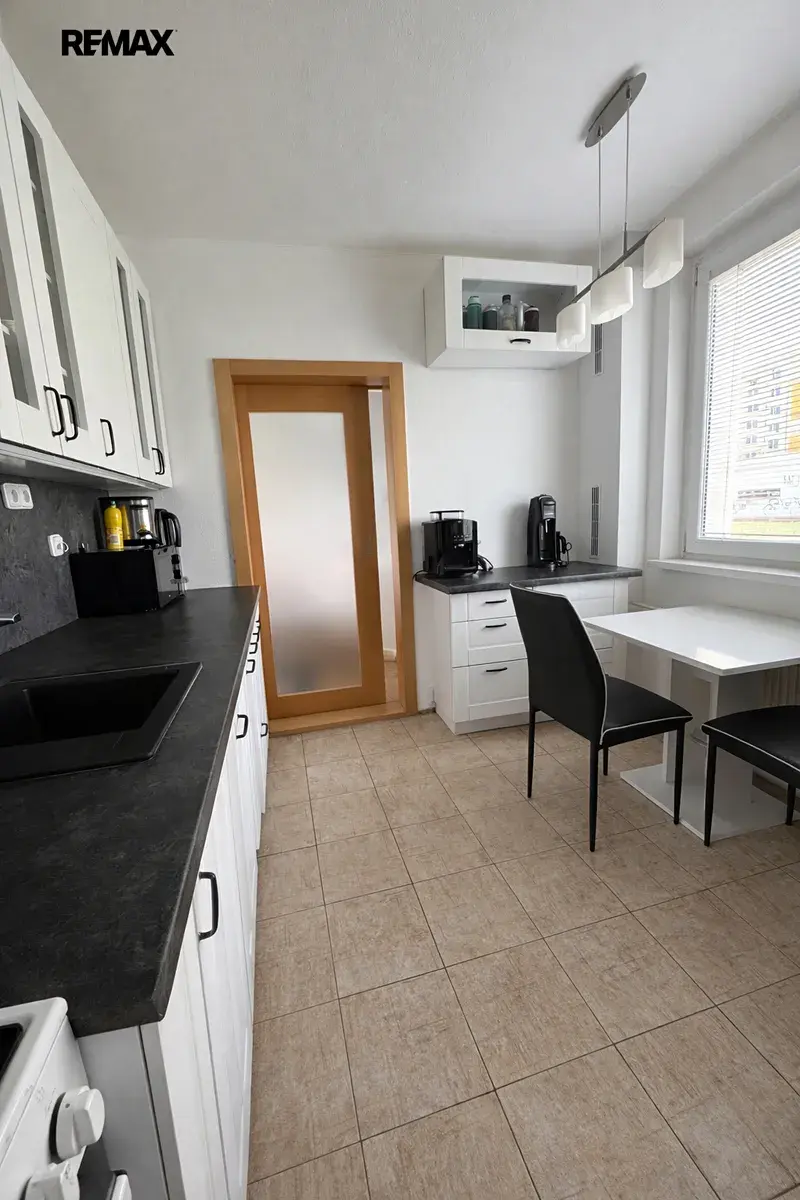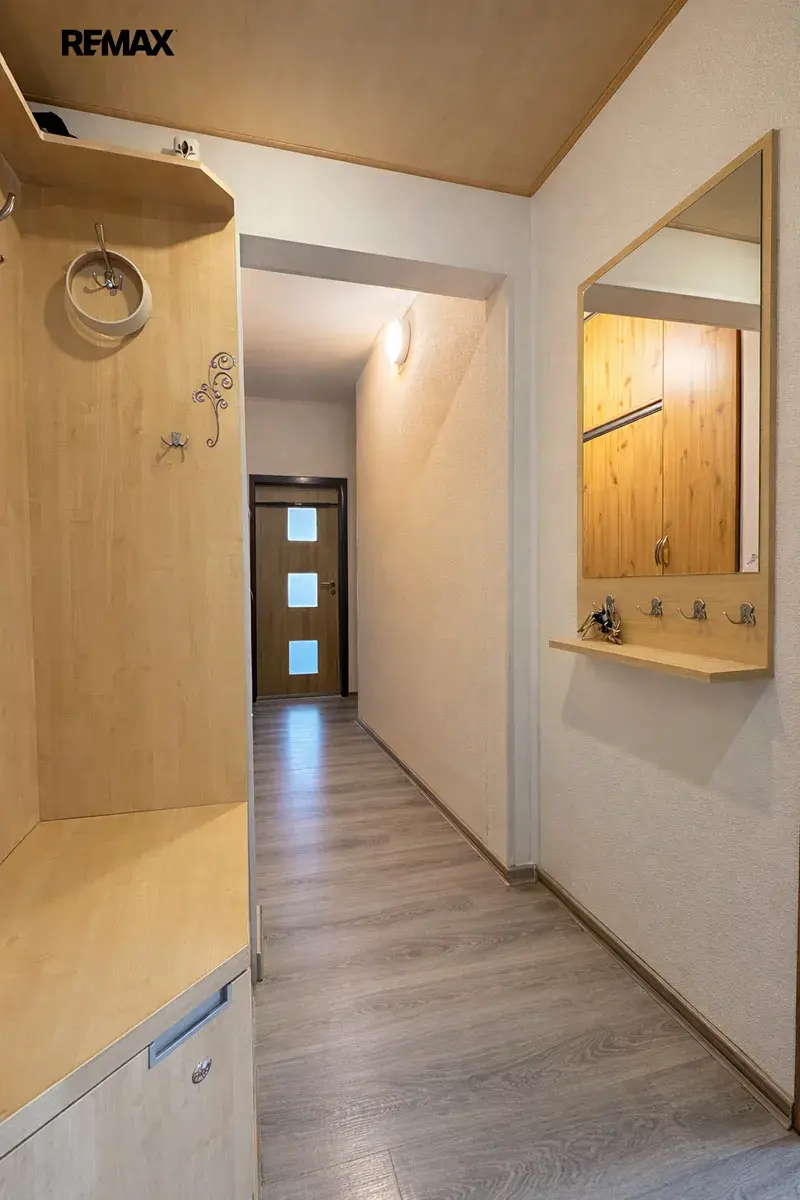 Byt nabízí praktické dispoziční řešení – najdete zde ložnici, samostatný pokoj vhodný jako dětský pokoj či pracovna, obývací pokoj, kuchyni, koupelnu s vanou a samostatné WC. Součástí bytu je také prostorná chodba s vestavnou skříní, praktická místnost na uskladnění věcí a botník řešený ve stylu menší komory. Příjemným bonusem je zasklená lodžie.
