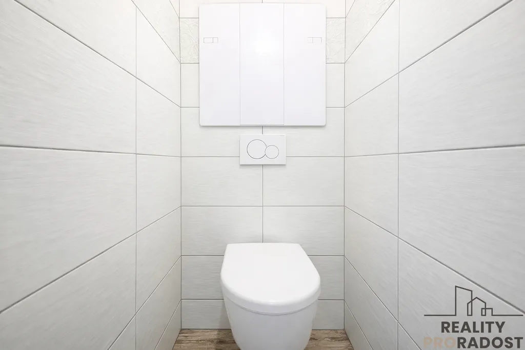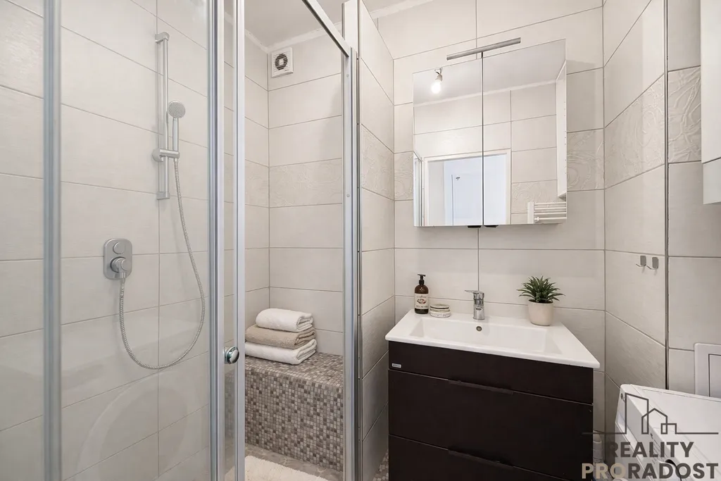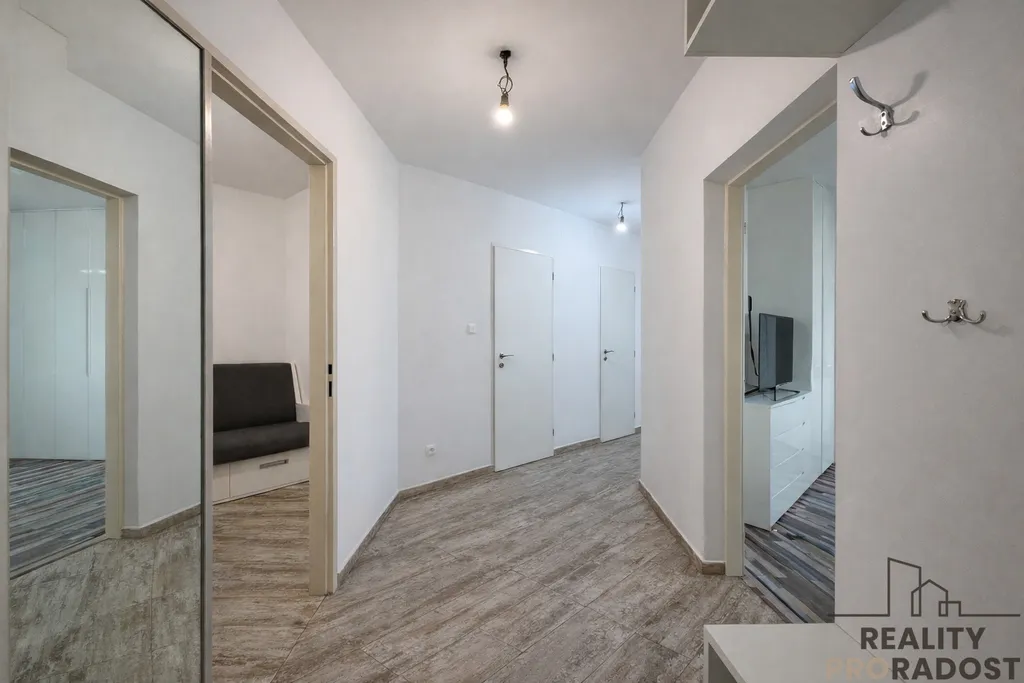 Dispozice zahrnuje prostorný obývací pokoj, samostatný dětský pokoj a kuchyň s moderní linkou včetně spotřebičů a jídelního kouta. Koupelna se sprchovým koutem, WC samostatné.