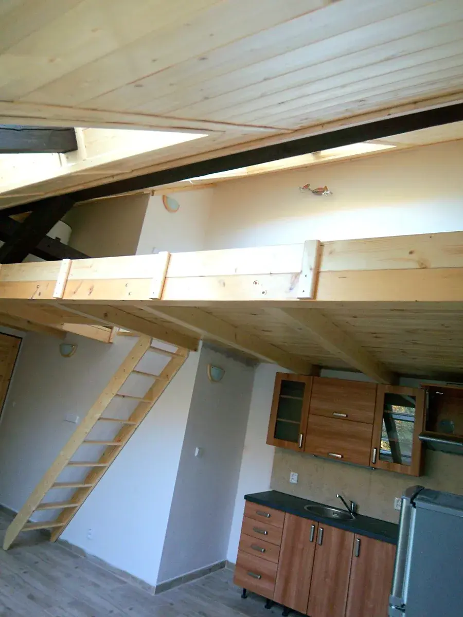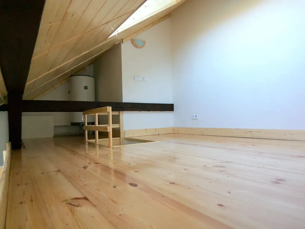 Pronájem pěkného půdního bytu 1kk (27m2) s pochozím patrem (6m2), Plzeňská ulice, Praha 5, hned u zastávky MHD Klamovka. V bytě je hlavní pokoj s kuchyňským koutem prosvětlený velkými střešními okny, kuchyňská linka se spotřebiči (sporák, digestoř a lednice). Koupelna s vanou, WC, umyvadlem. Pochozí patro přístupné po dřevěných schodech, ideální na ložnici. Vše pěkné, četné využití dřeva. Dostatečná izolace stěn pro zajištění tepelného komfortu. Byt je ve 3. patře cihlového domu, bez výtahu. Od května volné. Výborné spojení na metro Anděl.