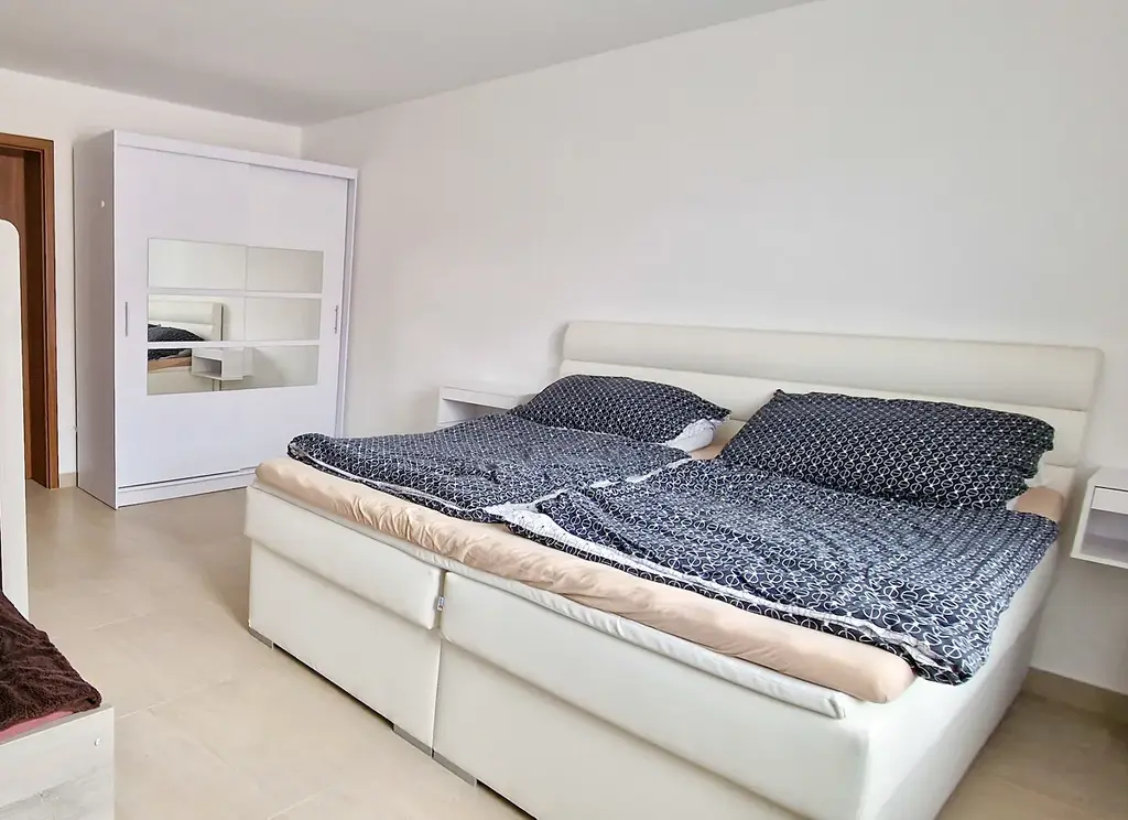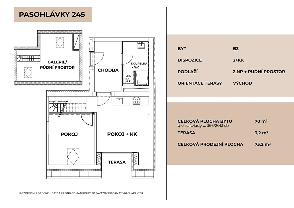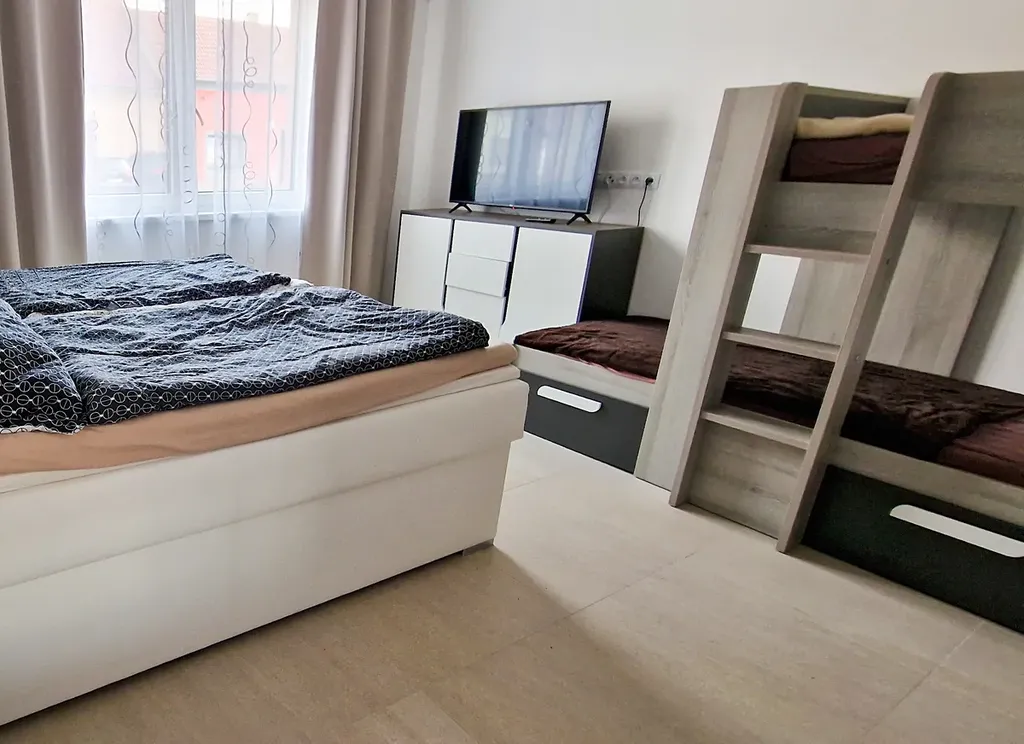 3. Kompletně vybavený byt 2+kk (82 m²) s balkónem (5,4 m²), ve kterém díky využití půdního prostoru vznikla další ložnice a úložný půdní prostor.