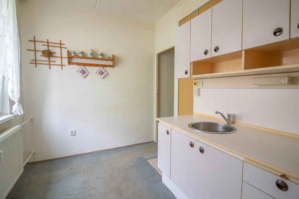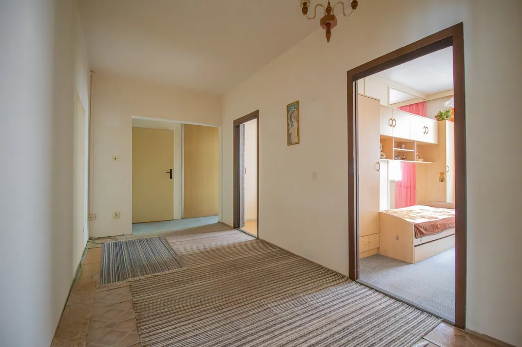 Vnitřní dispozice: Zádveří, prostorná předsíň, kuchyně s vestavěnou spíží. Prostorný obývací pokoj se vstupem na zmíněný zasklený balkon (8,36 m²), který v teplých měsících může sloužit jako další pokoj „pod širým nebem“. Ložnice a další dva samostatné pokoje, které lze spojit v jeden. Koupelna v původním, udržovaném stavu (jádro) se sprchovou vanou, umyvadlem a WC – ideální prostor pro realizaci rekonstrukce dle vlastních představ. Okna již vyměněna za moderní plastová.