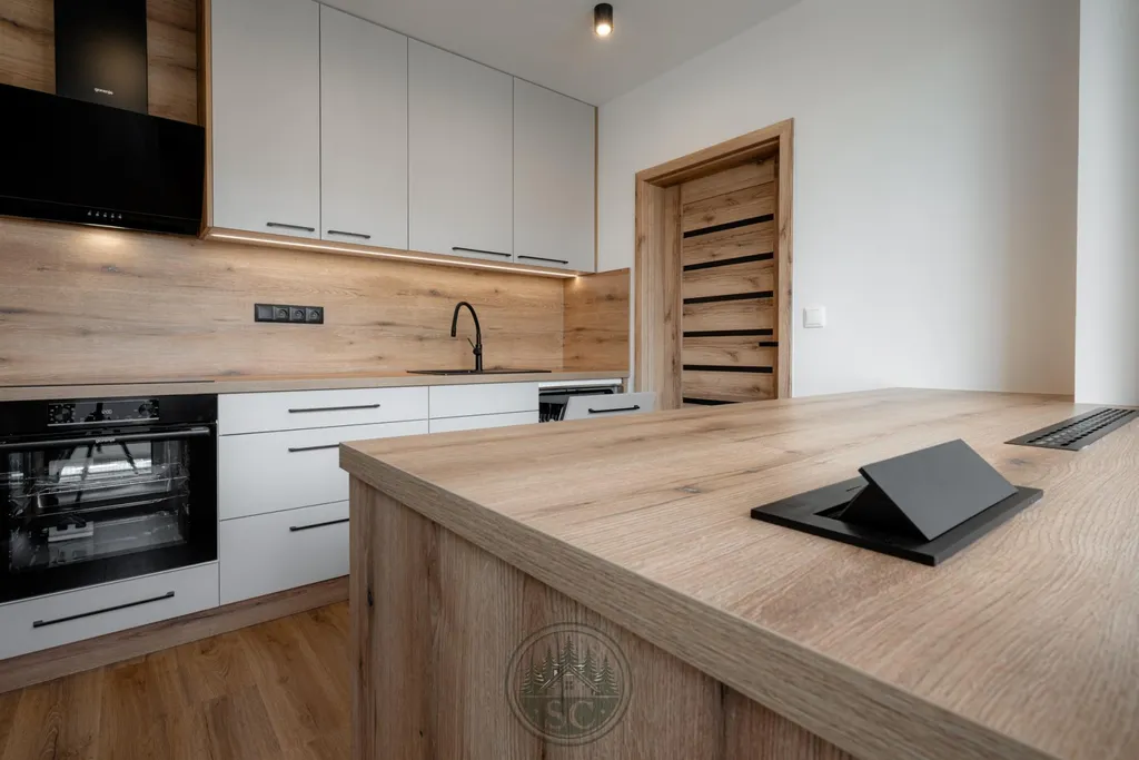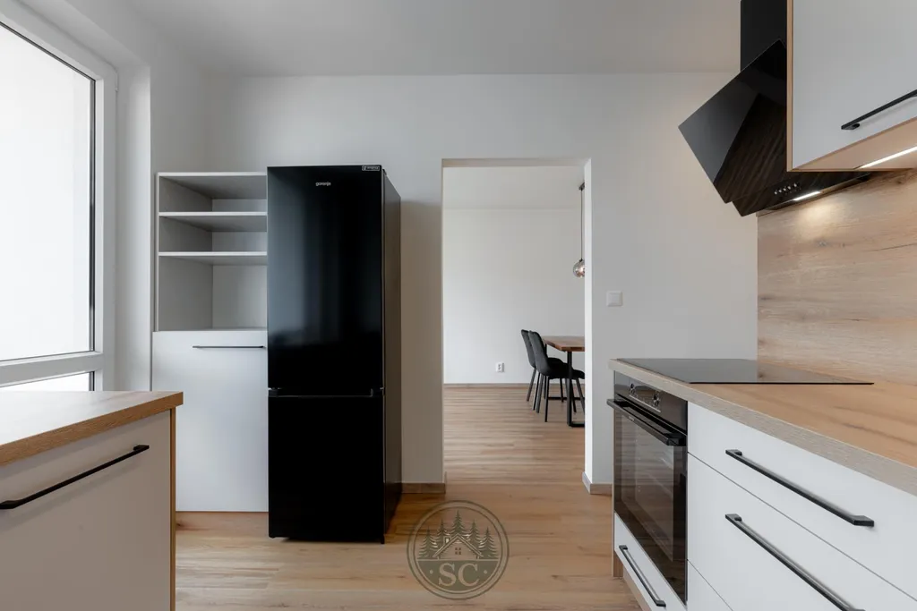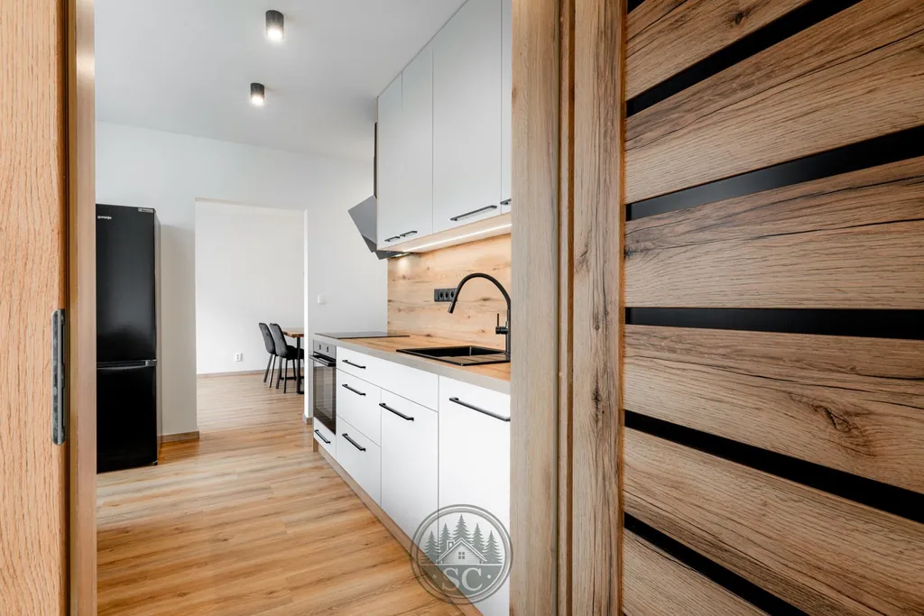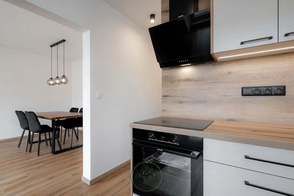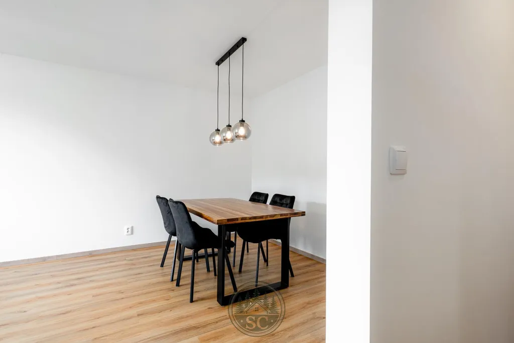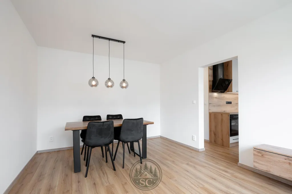 V bytě byly provedeny nové rozvody elektřiny i vody, proběhla kompletní nivelace podlah a následná pokládka vinylu se zvýšenou mechanickou odolností. Součástí je také jídelní stůl z masivu, designové osvětlení v podobě zavěšených kouřových svítidel a televizní stěna.