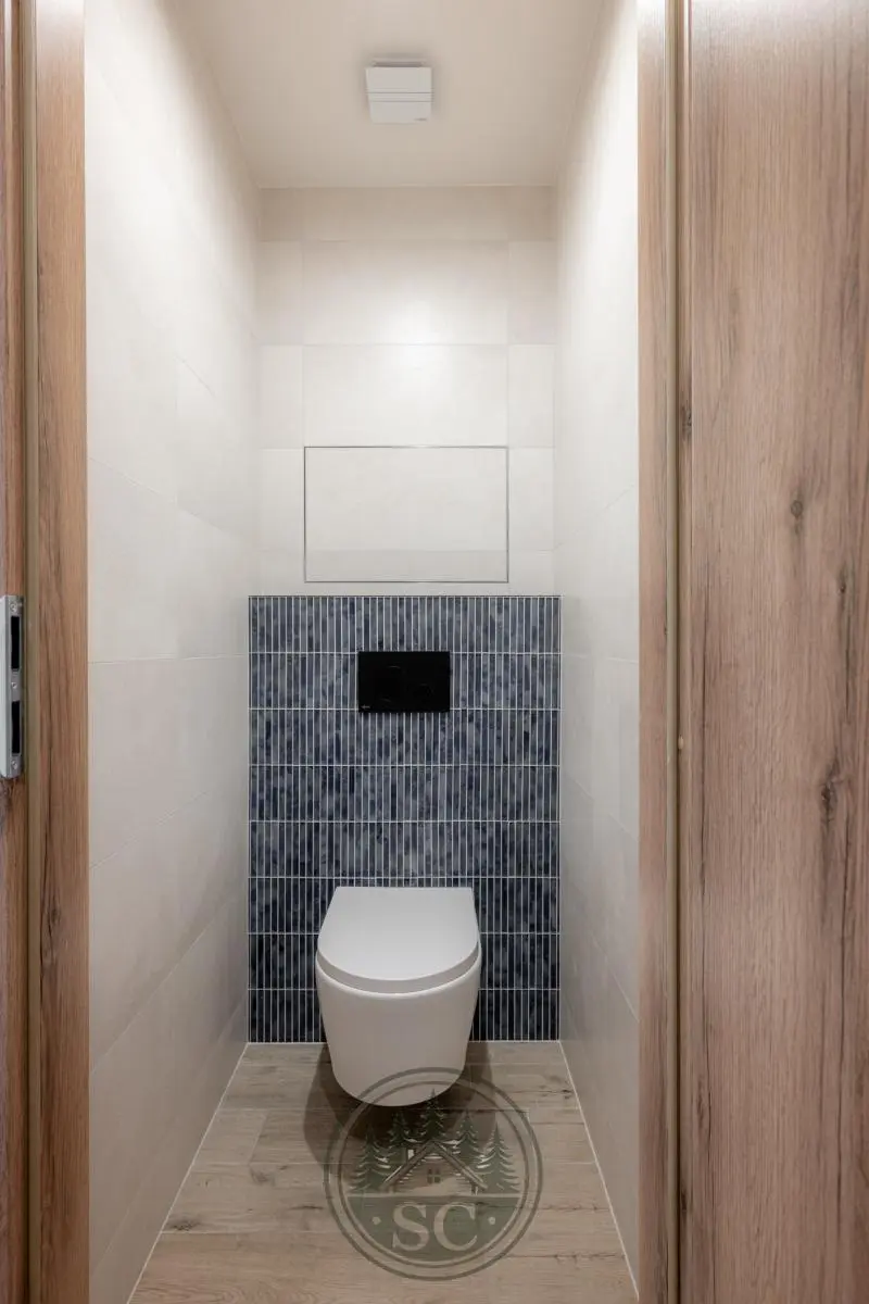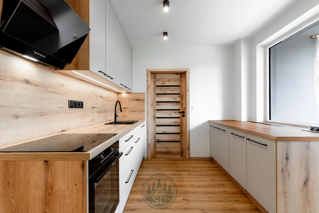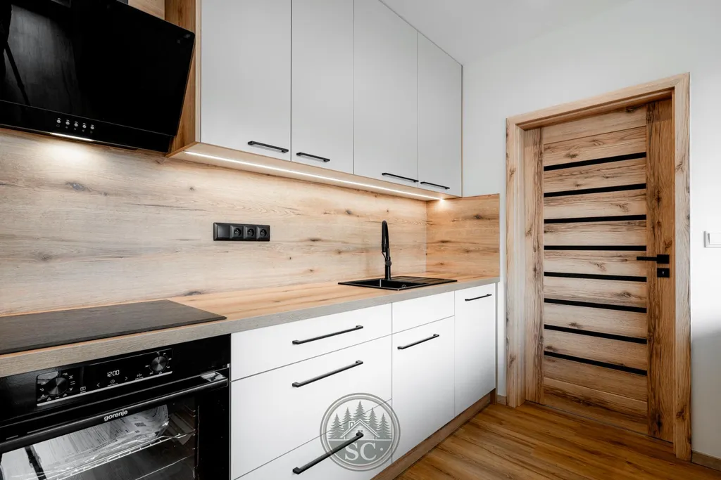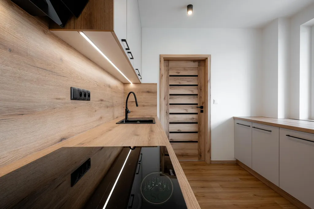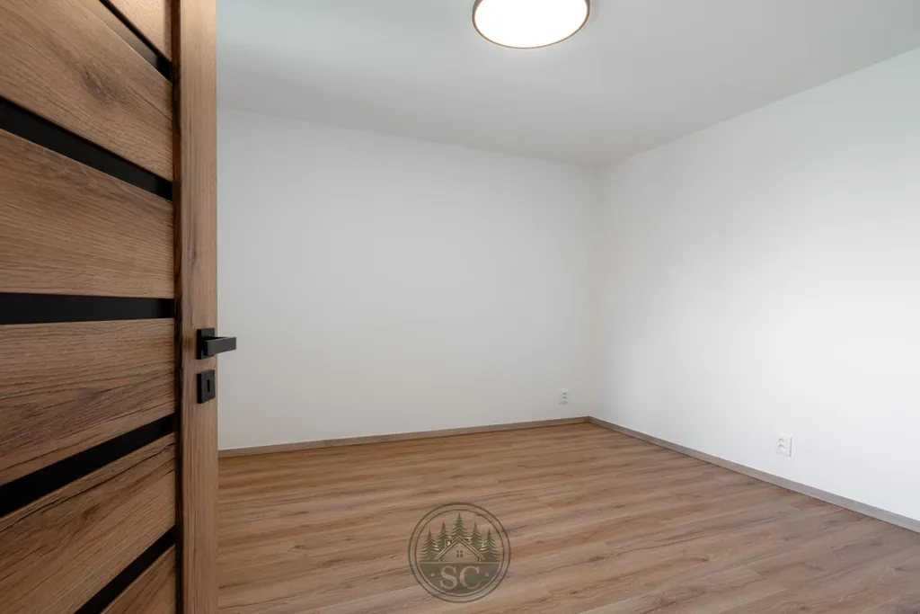 V bytě byly provedeny nové rozvody elektřiny i vody, proběhla kompletní nivelace podlah a následná pokládka vinylu se zvýšenou mechanickou odolností. Součástí je také jídelní stůl z masivu, designové osvětlení v podobě zavěšených kouřových svítidel a televizní stěna.