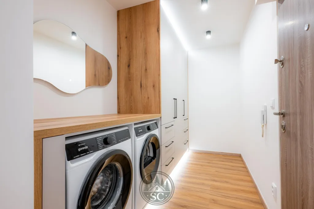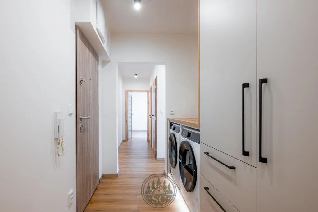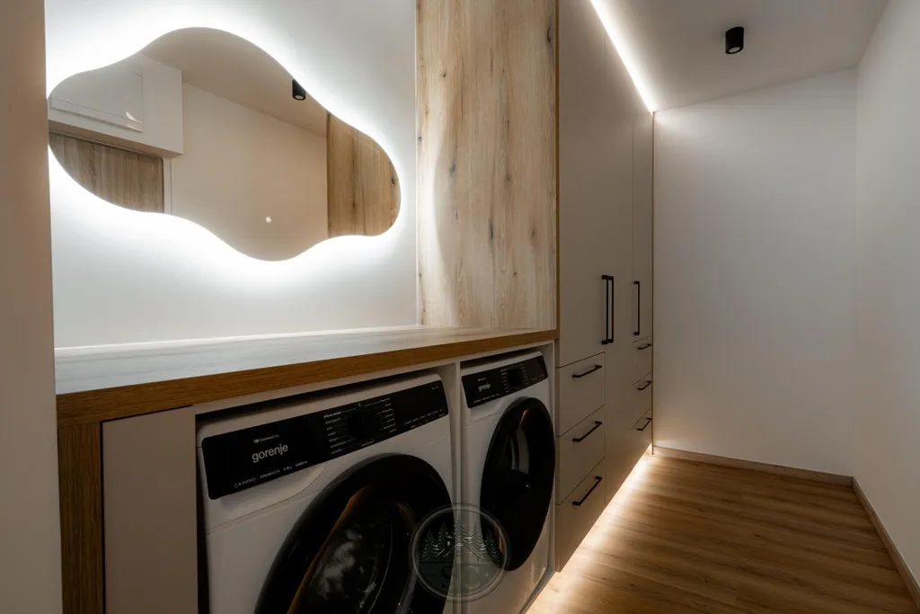 Hned při vstupu vás zaujme podsvícená vestavná skříň s integrovanou pračkou a sušičkou. Vestavné skříně i kuchyňská linka jsou vyrobeny na míru od truhláře, což je znát na použitých materiálech i kvalitě zpracování.