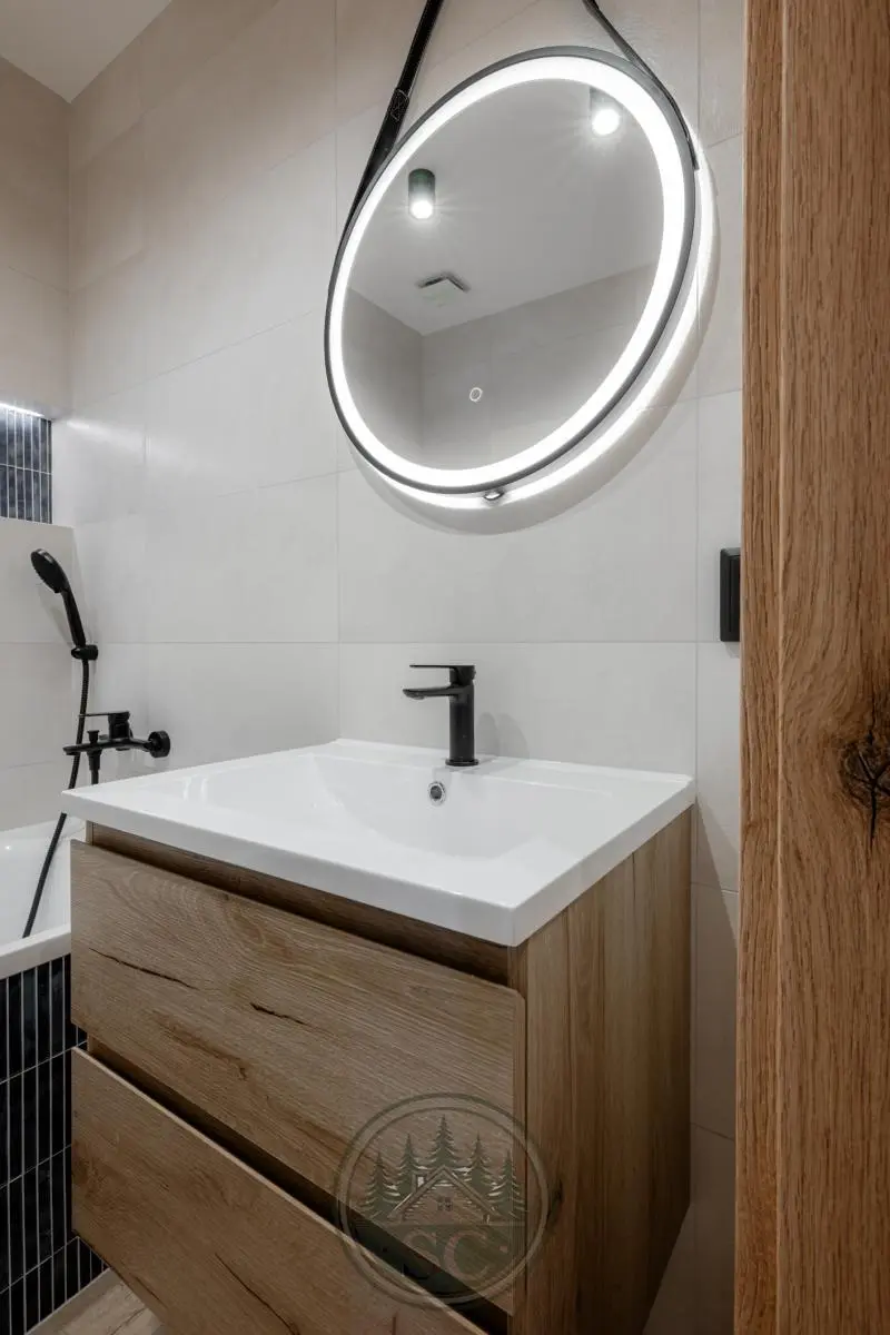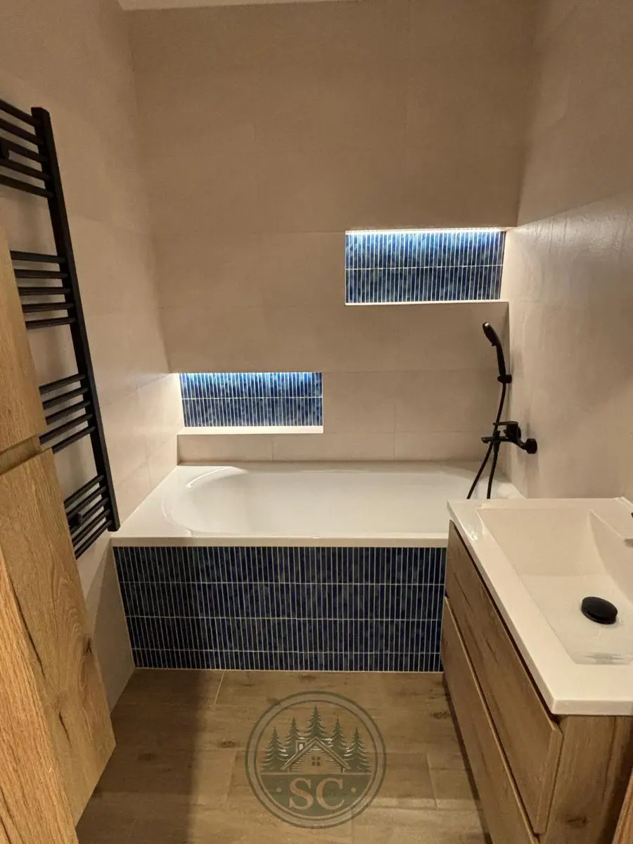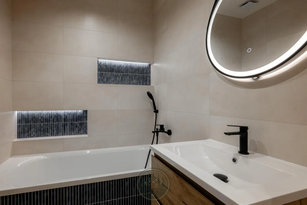 Koupelna nabízí vanu, podsvícené niky s jemným modrým akcentem, zrcadlo s volbou světelného tónu, černé baterie, topný žebřík a skříňky v dekoru dřeva.