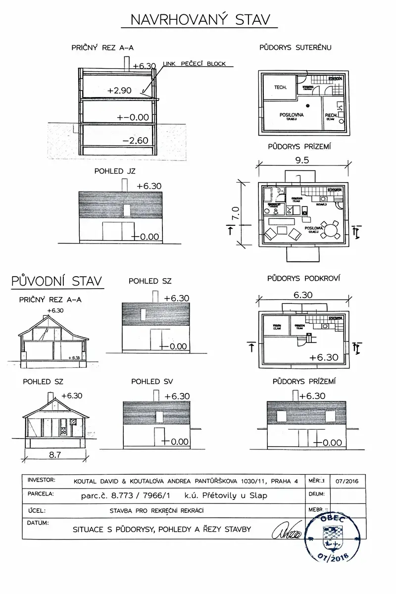 Velkou předností nabídky je již povolená výjimka ze stavební uzávěry, která umožňuje ihned podat žádost o stavební povolení na odstranění stávajícího rekreačního objektu a výstavbu nového celopodsklepeného domu se dvěma nadzemními podlažími o zastavěné ploše 66,5 m², tedy s celkovou plochou cca 199,5 m².
