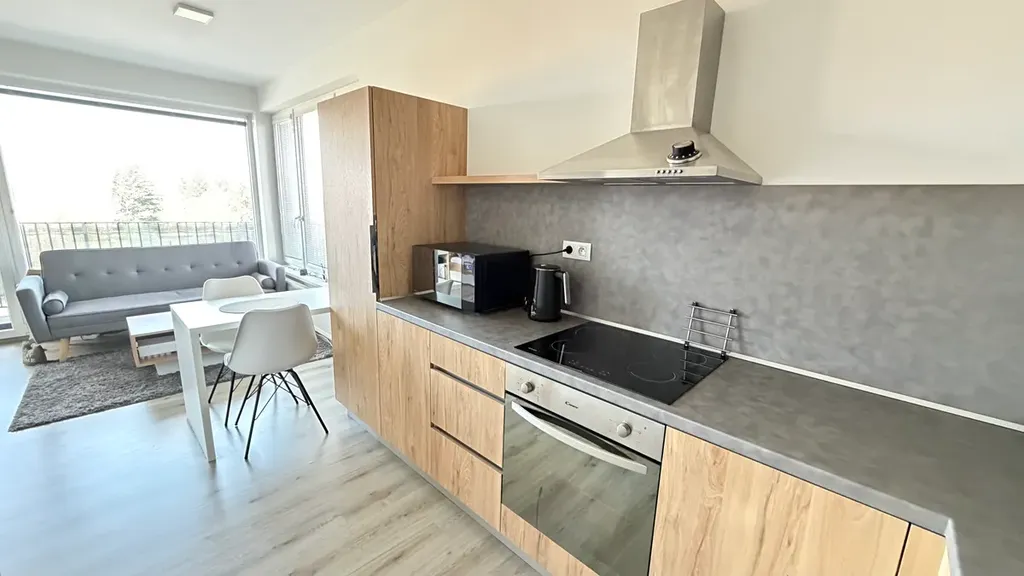 Jednotka se pronajímá kompletně zařízená – přesně tak, jak vidíte na fotografiích. K dispozici je plně vybavená kuchyňská linka včetně spotřebičů, jídelní stůl se židlemi, pohodlná sedačka, postel, vestavěné skříně s dostatkem úložného prostoru i vybavená koupelna s pračkou. Díky tomu vám odpadá starost i náklady spojené se zařizováním bytu.