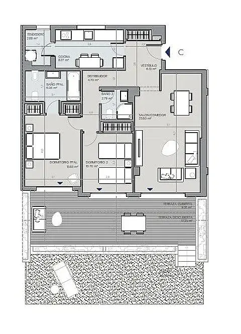 U nabízené konkrétní jednotky se jedná o byt o dispozici 3+kk (2 ložnice). Dispozice je navržena s důrazem na funkčnost a komfort – obývací pokoj s kuchyňským koutem, dvě samostatné ložnice, koupelna a přímý vstup na terasu.