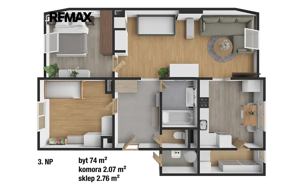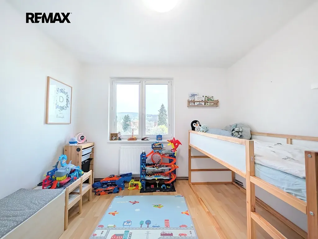 Hlavním benefitem bytu je velkorysý obývací pokoj (25 m²), který nabízí dostatek místa pro rodinné zázemí. Na něj navazuje samostatná kuchyně (10 m²) s moderní kuchyňskou linkou a vestavěnými spotřebiči. Za kuchyní se nachází praktická spíž/komora s oknem, ideální nejen pro skladování, ale i pro umístění pračky a sušičky. Byt dále disponuje dvěma samostatnými ložnicemi orientovanými na sever (11 m² a 12 m²), zatímco kuchyň a střešní okno v obývacím pokoji směřují na jih, což zajišťuje příjemné světelné podmínky během celého dne. Součástí bytu je také centrální chodba, ze které je vstup do všech místností, dále koupelna po rekonstrukci z roku 2020 s vanou a samostatná toaleta.