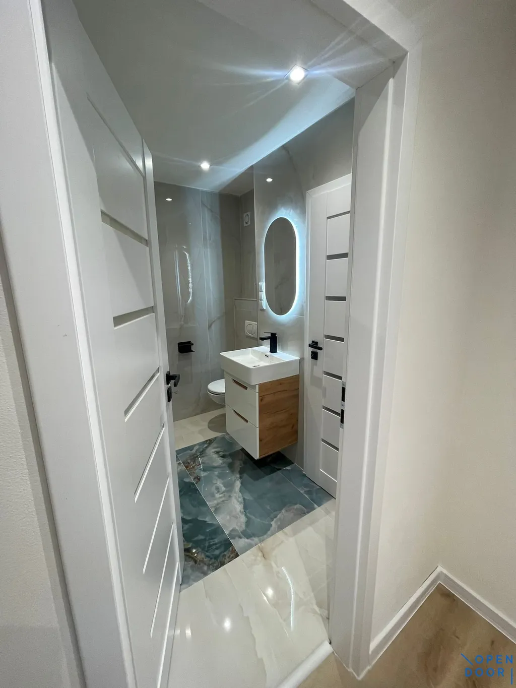 Koupelna je obložena designovým keramickým obkladem. Disponuje vanou, závěsnou toaletou a umyvadlovou skříňkou se zrcadlem vč. LED podsvícení.
