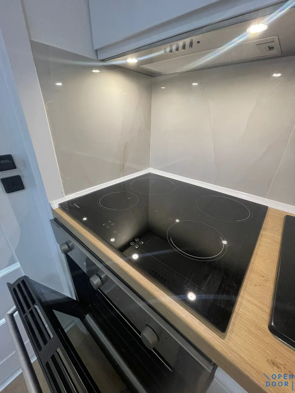 Součástí linky je vestavná horkovzdušná trouba, indukční varná deska, digestoř (značky Candy) a granitový dřez.