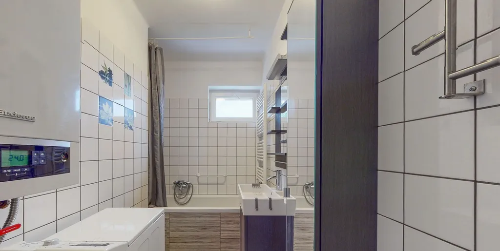 O vytápění a ohřev teplé vody se stará vlastní plynový kotel, což umožňuje efektivní regulaci nákladů na bydlení.