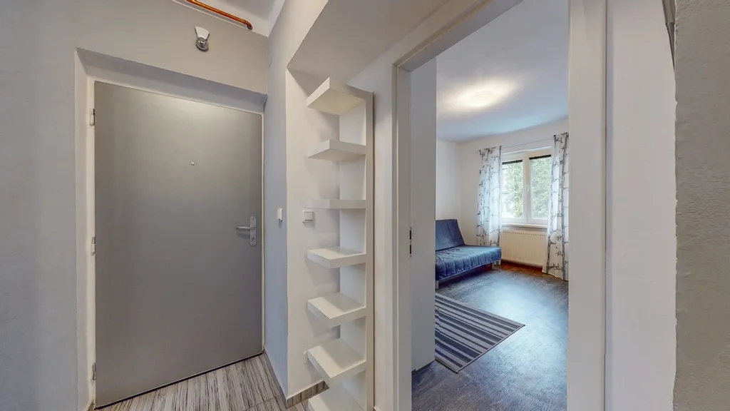 Dispozice bytu zahrnuje vstupní předsíň, samostatnou koupelnu, oddělené WC, prostornou kuchyni a tři neprůchozí pokoje, které poskytují dostatek soukromí pro rodinu i jednotlivce. K bytu náleží také sklepní kóje, která zajišťuje praktický úložný prostor.